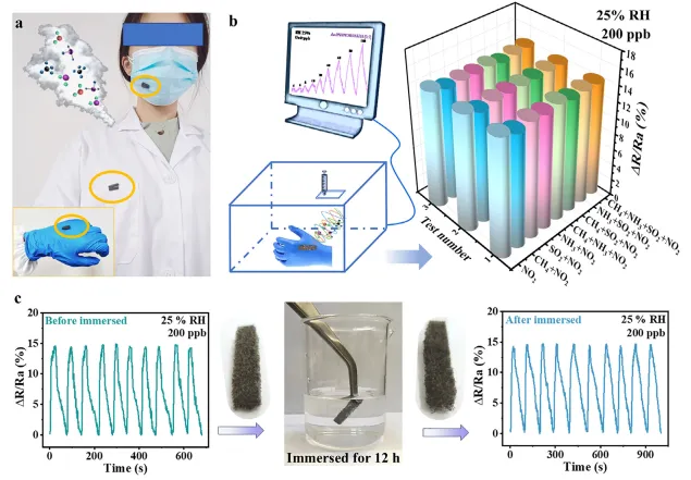环境适应性:具备优异防水性,水浸泡12小时后,传感层无剥离,对200 ppb NO₂的响应保持稳定(论文1 Fig. 5c;2.5节)。