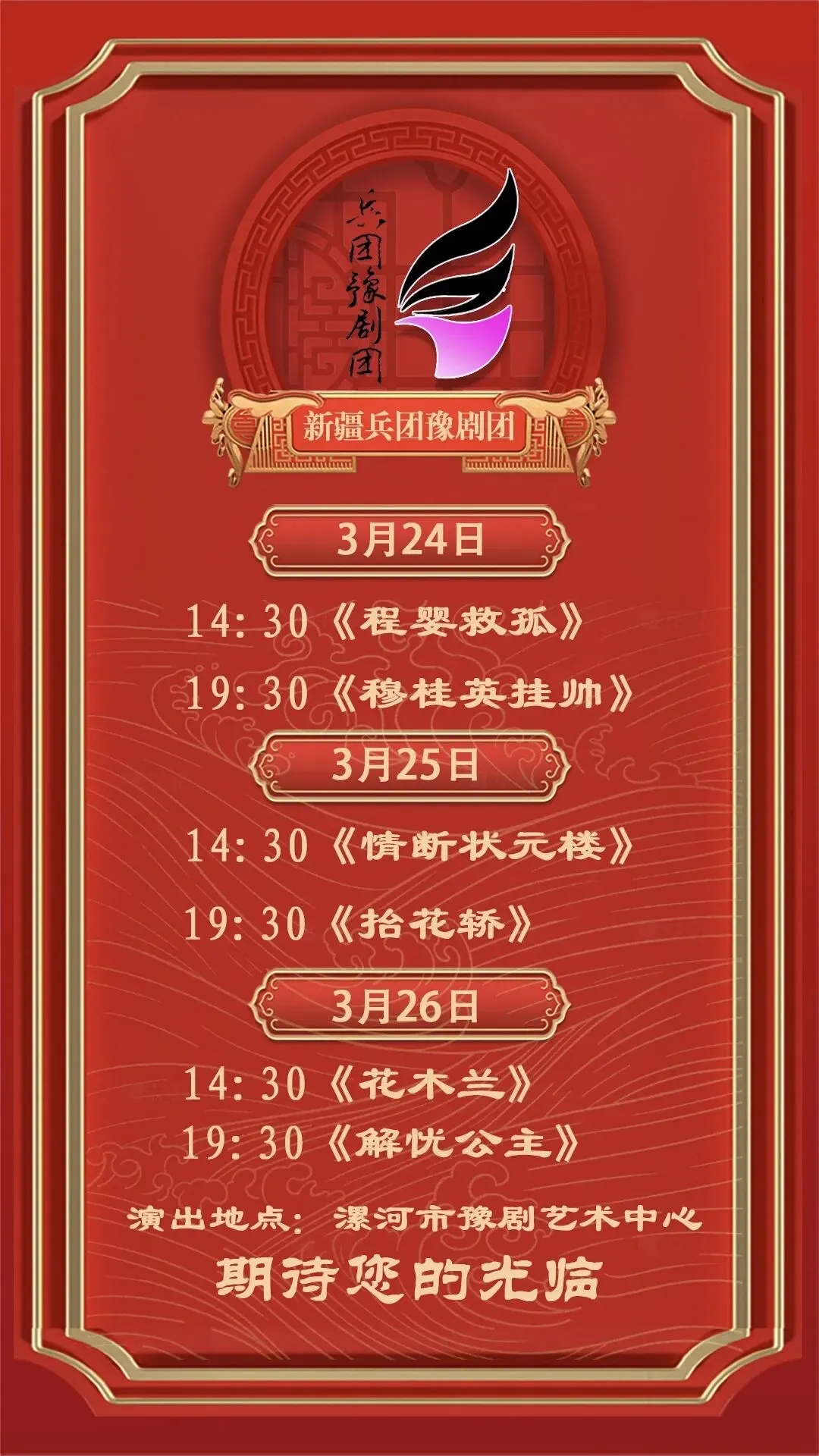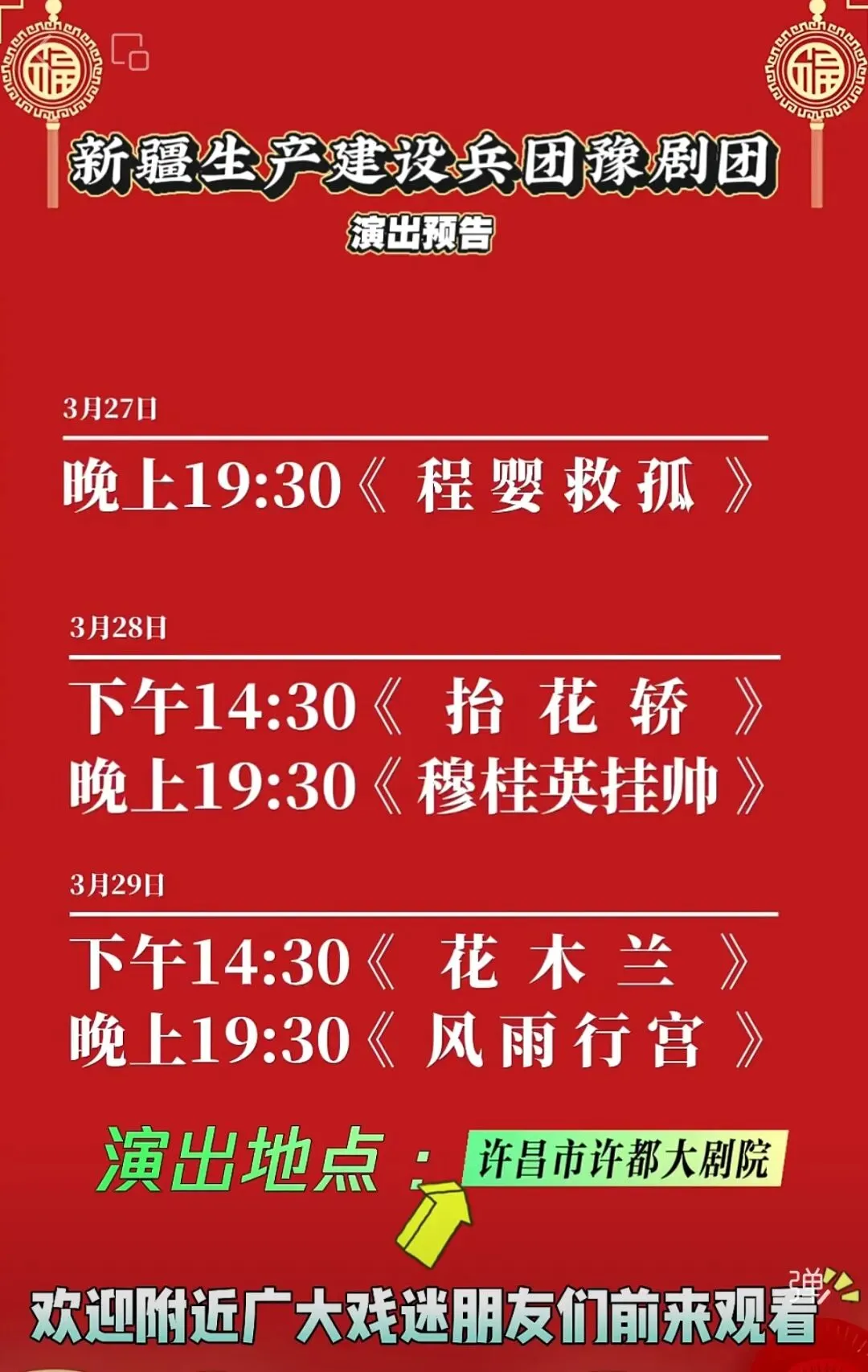同时,新疆兵团豫剧团将于3月24日-26日,在漯河市豫剧艺术中心剧院演出六场大戏。于3月27日-29日,在许昌市许都大剧院演出五场大戏,欢迎戏迷朋友届时购票现场观看!