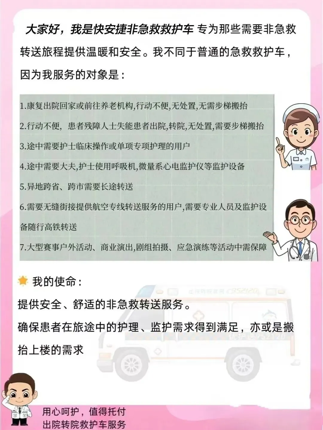 我们提供非急救120转运服务,专业承接各类病人转运:包括长途跨省转运新生儿、骨折患者、重症及危重症患者;行动不便者复查、转院;以及遗体转诊、跨省回家、遗体运送返乡等业务,我们均能专业承接。