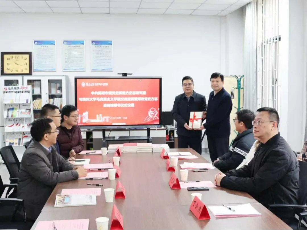 会谈交流后,双方举行了隆重的赠书仪式,郑州市委党史和地方史志研究室向学院捐赠了一批郑州党史、地方史志相关书籍,为学院思政教学和科研工作增添了丰富的本土资料支撑。