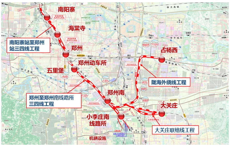 根据环评可知,新建京广客线自既有京广线K683+800 处引出,并行既有线东侧新建双线向南行进,下穿南四环、郑西客专,上跨十七里河后,进入新建郑州南站;出站后下行线上跨陇海外绕线、出入段线后与继续向南行进,上跨潮河、下穿绕城高速后,新建京广上、下行客线于既有京广线 K694+390 处与既有线衔接,并设小李庄南线路所。区段线路长度为18.263km(含利用既有线7.647km);其中:新建双线5.542km,新建单线10.112km(含右线绕行段)。