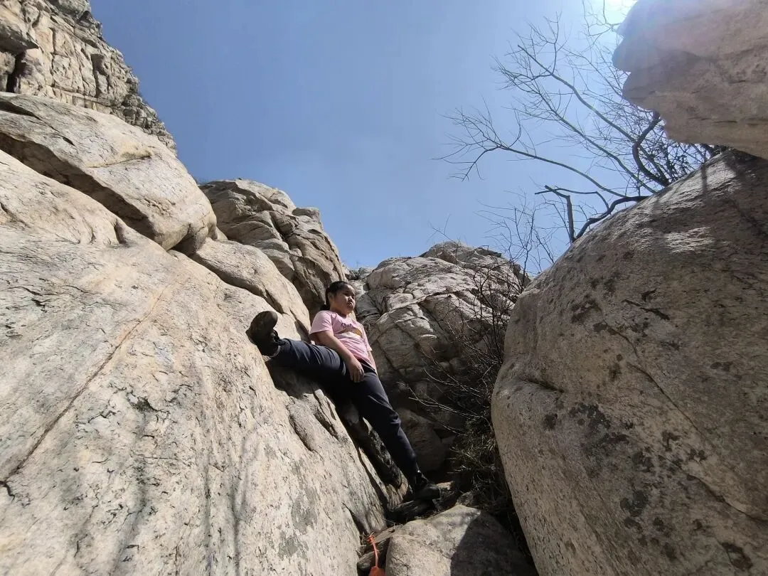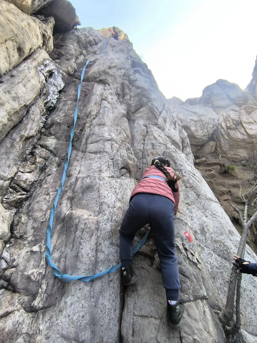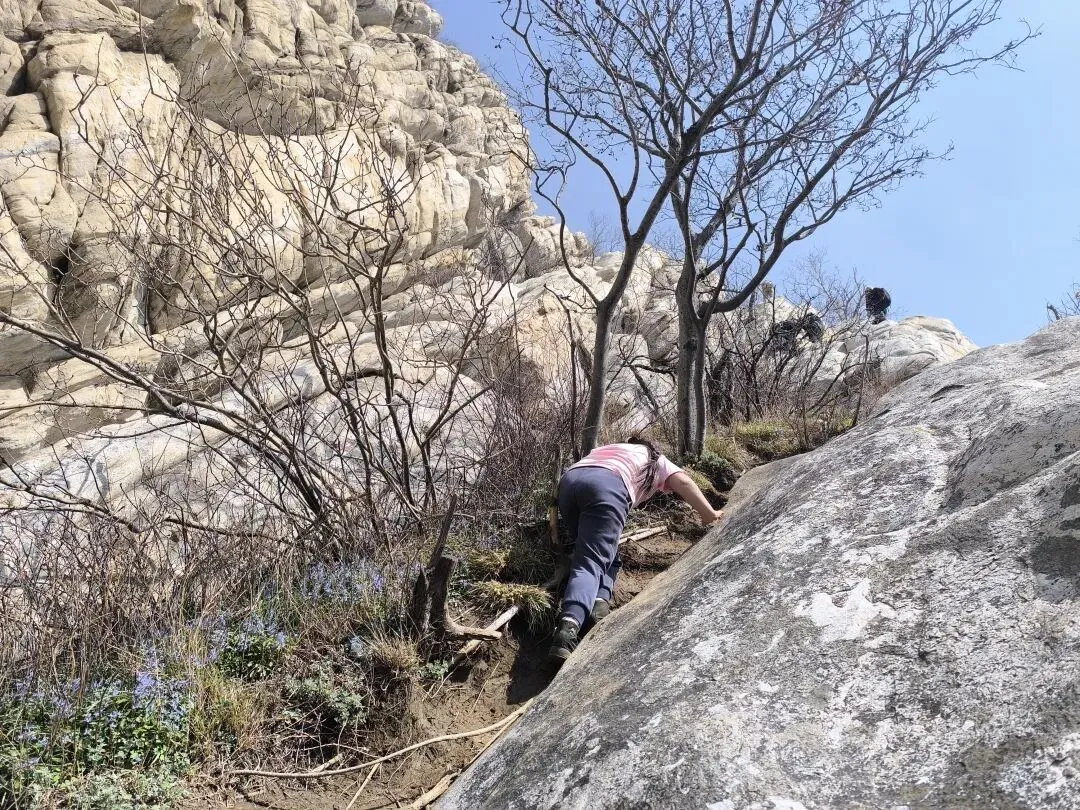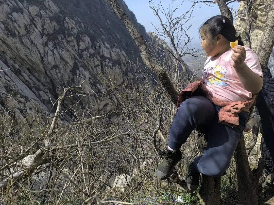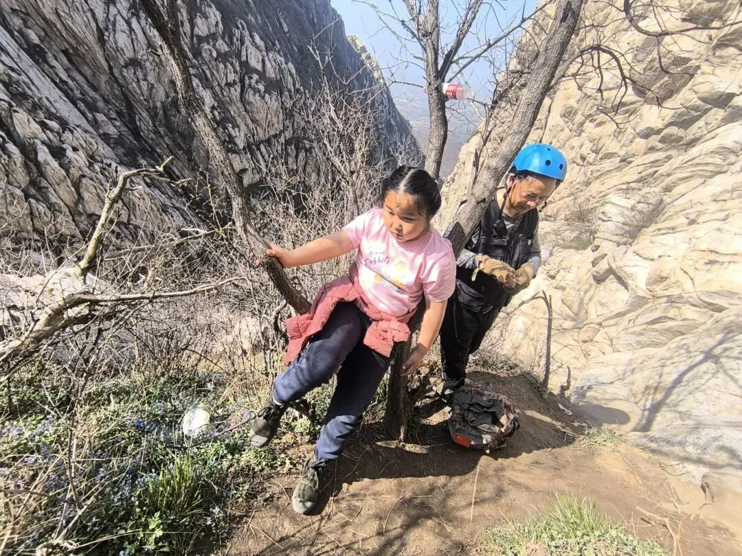 本周六,天气晴朗,云淡风轻,正是爬山好日子。听说玉皇沟进山口封了,队长带我们上灵隐峰——今年应该是第二盘了。 空山幽谷,漫山遍野点缀杏花,绽放春色,情不自禁深呼吸;鸟儿鸣唱,泉水叮咚,新芽吐绿,令人心旷神怡! 迷你版瀑布,飞流直下,水花四溅,驻足凝望,心情指数五颗星。 一路拔高,不觉气喘吁吁,走到这里休息一下,喘口气,哈哈,这个角度,像只戴着披风的乌龟,想要飞上天! 近两个月没有爬山了,体力与体能都需要再次恢复,还好,今天路线不长。 第一道攀爬点,队长徒手攀岩,准备下绳。几路爬山大神,各显神通,徒手爬上去了。 茉同学腰系安全绳,凭借队长和舅舅指挥加助力,第一关,轻松拿捏。 一路向上,岩壁攀爬居多,小朋友找个树杈休息,开心地说,这可以天然沙发,真舒服! 开满鲜花的山坡,芬芳扑面而来,小朋友忍不住赞叹,妈妈,这里也太美了吧,花儿可真香啊! 妈妈,我坐这儿拍照,少个道具吧?小朋友看到舅舅在剥沃柑,笑着问。