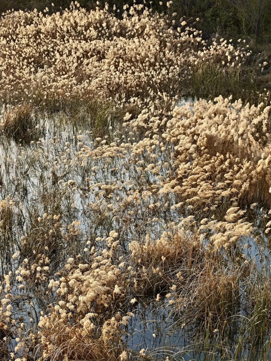 刚走进公园的那一刻,视线所及之处,没有高楼,没有车流,只有满眼的绿意与辽阔。脚下是平整的步道,踩上去软软的,像是给双脚做了一场温柔的按摩,步道两旁是不知名的野花,红的、黄的、紫的,星星点点地散落着,没有刻意的修剪,却美得浑然天成。往前走,视野突然豁然开朗,大片大片的芦苇荡瞬间撞入眼帘,那一刻我真的被震撼到了。不是零星的几株芦苇,而是绵延数里的芦苇海洋,风一吹,芦苇秆轻轻摇曳,芦花随风飘荡,像一片流动的金色云海,阳光洒在上面,每一根芦苇都闪着细碎的光,美得像从油画里走出来的一样。