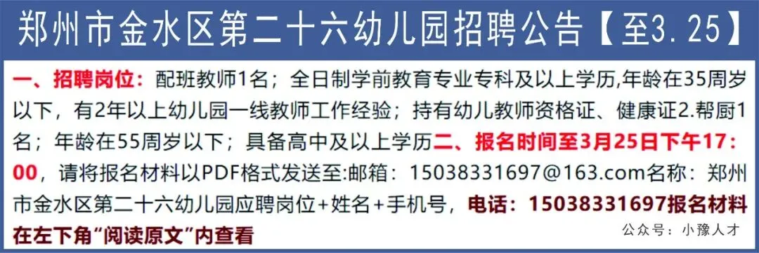 >郑州市金水区第二十六幼儿园招聘公告【至3.25】