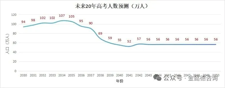 峰值过后自然回落,到2040年,高考人数或将降至56万左右,相比如今近乎腰斩。
