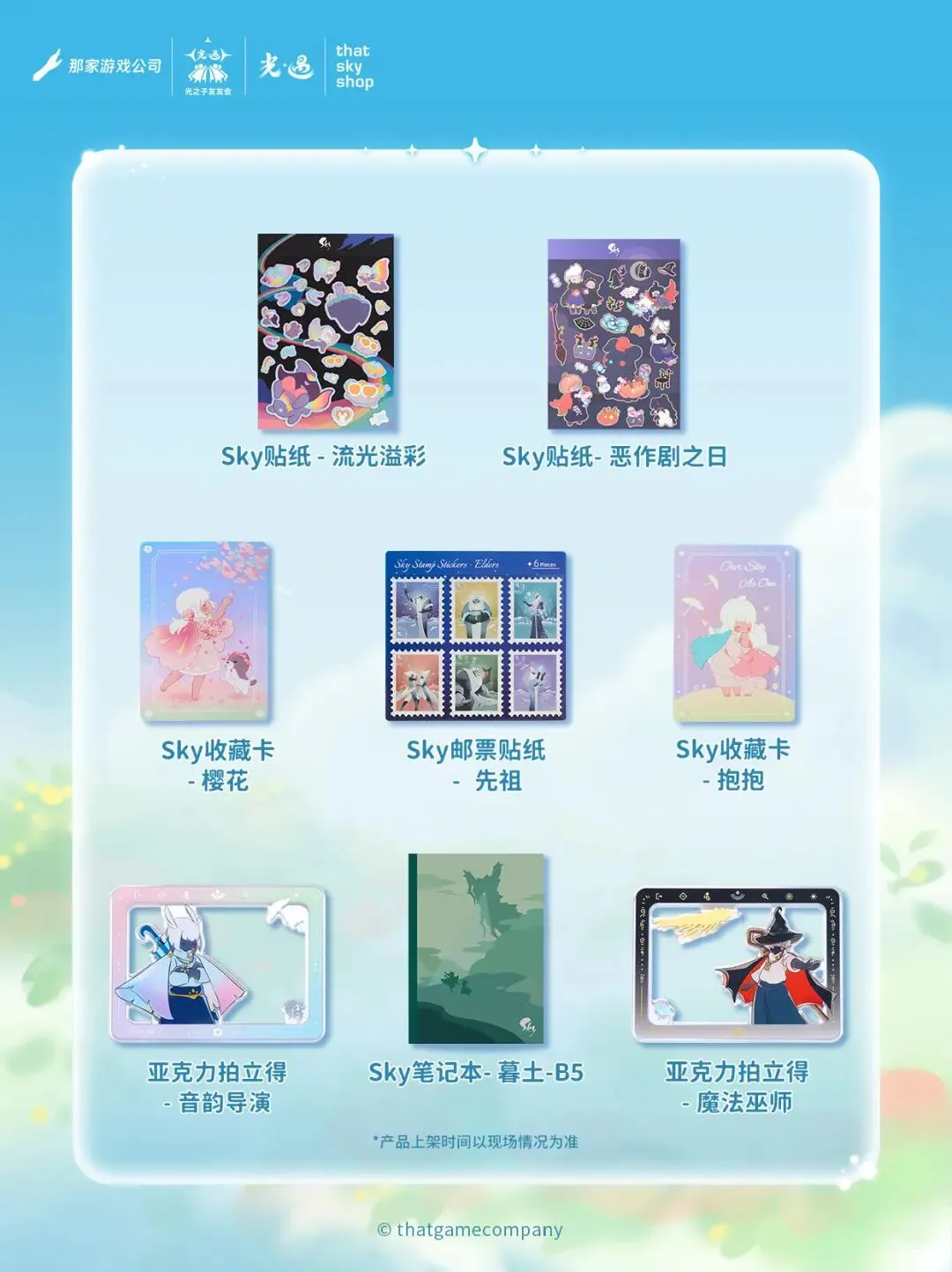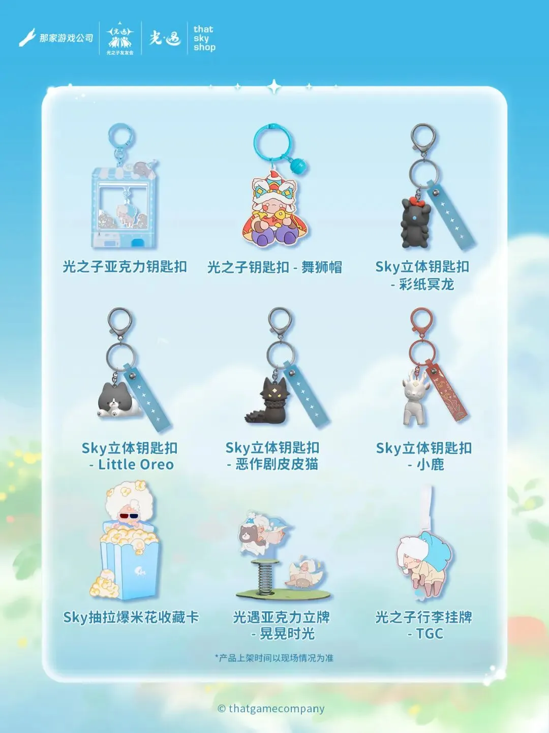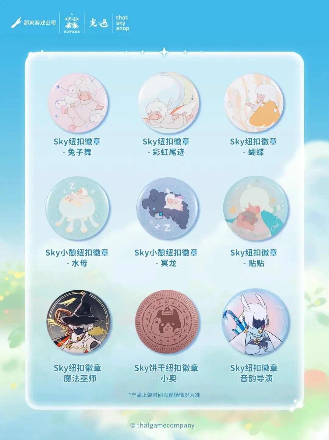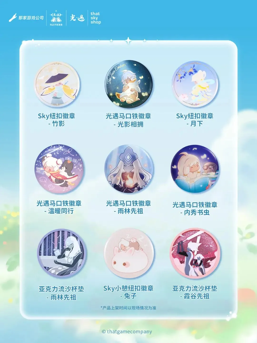 光遇金属书签 - 洛城闻笛、光遇亚克力可晃钥匙扣 - 樱花、光遇亚克力可晃钥匙扣 - 紫藤花、光遇亚克力可晃钥匙扣 - 马蹄莲、Sky小憩纽扣徽章 - 冥龙、Sky x Moomin 光栅纽扣徽章 - 友谊 I、Sky纽扣徽章 - 贴贴、Sky贴纸 - 流光溢彩、Sky立体钥匙扣 - 彩纸冥龙、Sky立体冰箱贴 - 鲲鹏、Sky立体冰箱贴 - 小奥