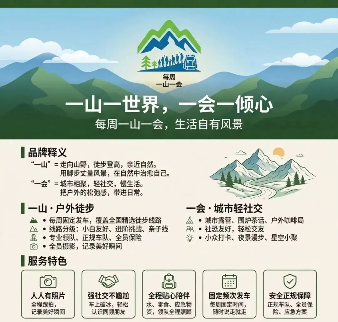 「每周一山一会」要做郑州本土最懂户外、最懂年轻人社交的徒步社群,我们拒绝走马观花,只做有温度、有深度的山野连接。我们想在郑州做一个不一样的户外圈子。