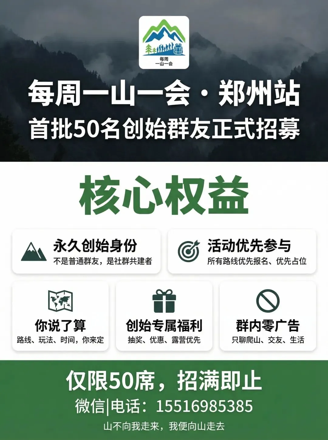 现在,「每周一山一会」郑州创世会员正式开启招募——仅限50席,永久权益,专属编号,创世证书。我们要找的,就是敢先出发的你!