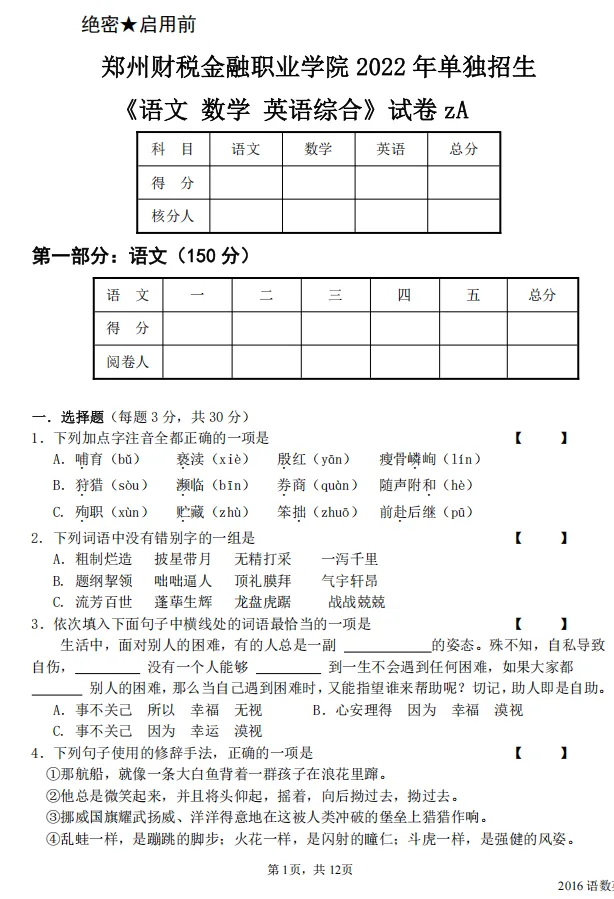 同学们大家有好,今天作者给大家汇总整理的资料是郑州财税金融职业学院2025年单独招生考试样题(附历年单招《语文 数学 英语综合》试卷),需要的同学可自行下载打印。【