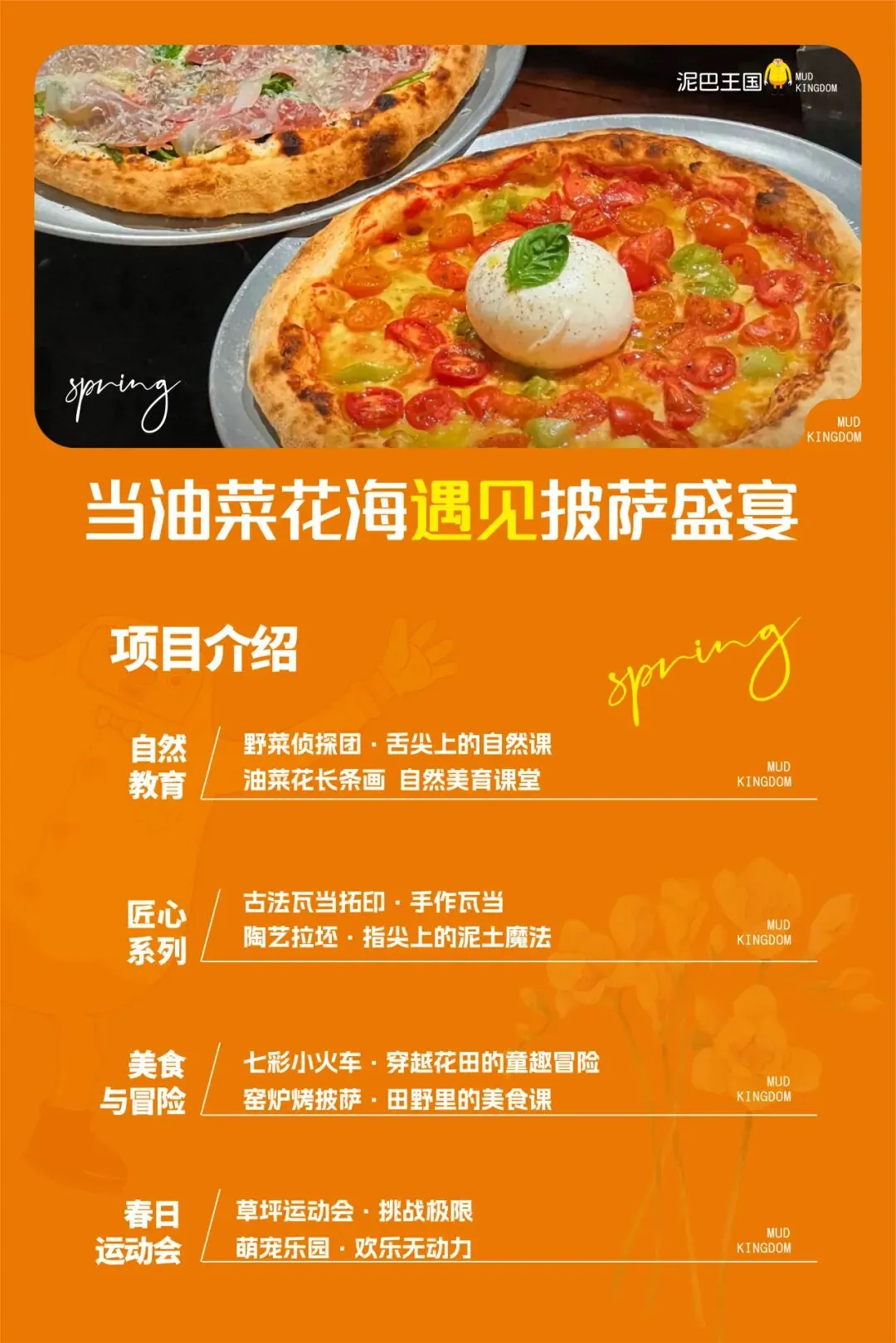 春风拂过泥巴王国的田野,金黄的油菜花海随风摇曳,泥土的芬芳裹挟着孩子们的欢笑声——2025年的春天,我们为孩子们准备了一场“玩中学、学中悟”的研学盛宴!在占地百亩的自然基地里,七大特色项目融合自然探索、传统文化、艺术创造与体能挑战,让孩子在泥土与花香中,触摸春天,收获成长!