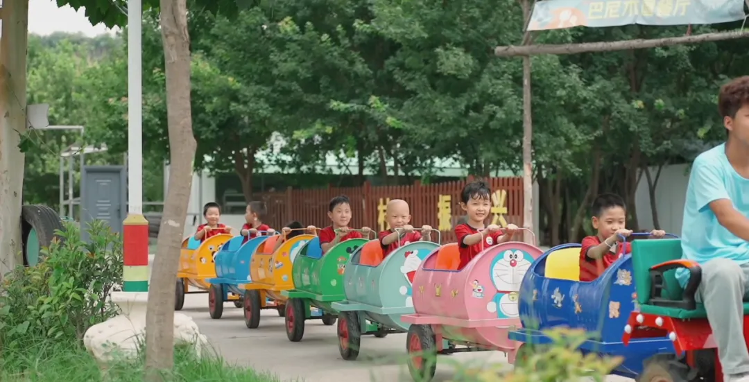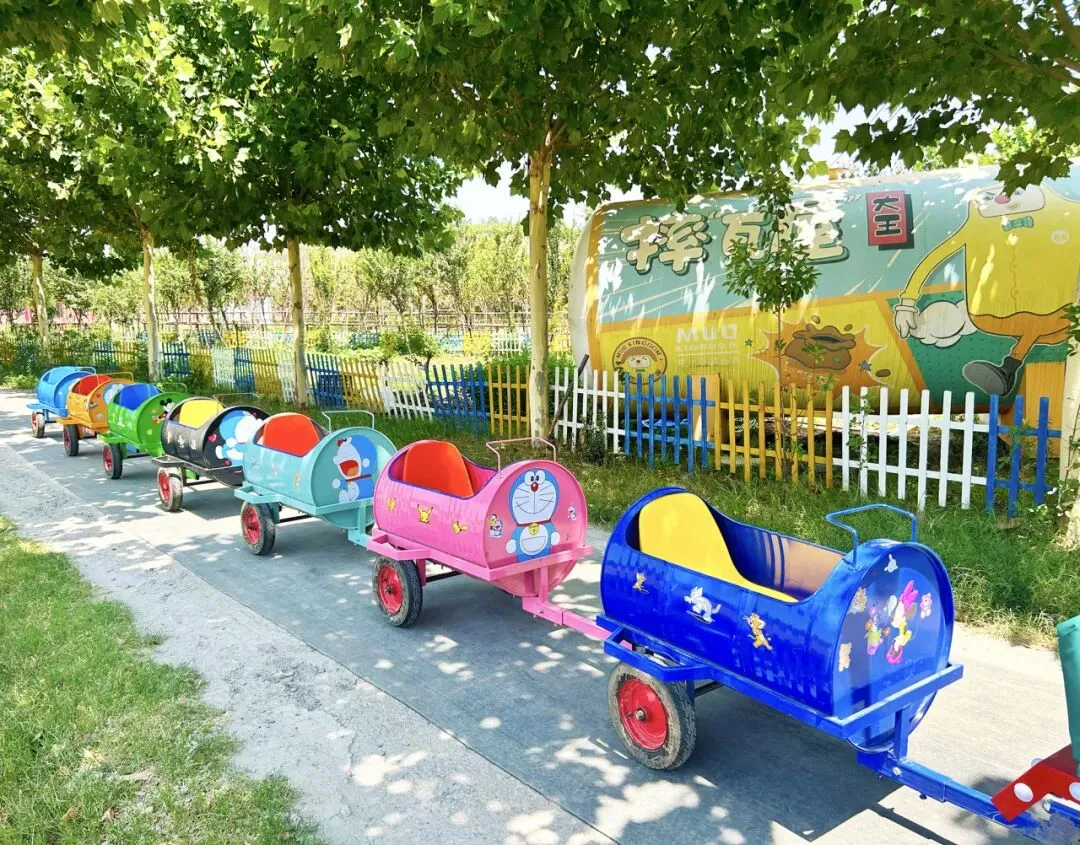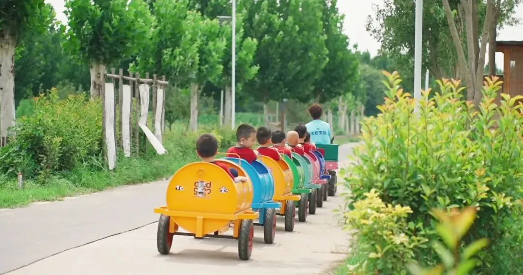 哐当哐当——彩色油桶变身童话列车!孩子们乘坐五彩小火车穿梭于油菜花田与森林小径,沿途寻找藏在树梢的“植物任务卡”。
