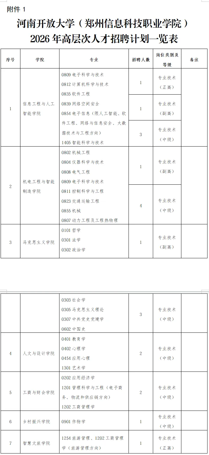 根据我校岗位空缺情况和事业发展需要,2026年拟公开招聘领军型人才、优秀博士、高技能人才、行业资深实践型人才20人。详见《河南开放大学(郑州信息科技职业学院)2026年高层次人才招聘计划一览表》(附件1)。