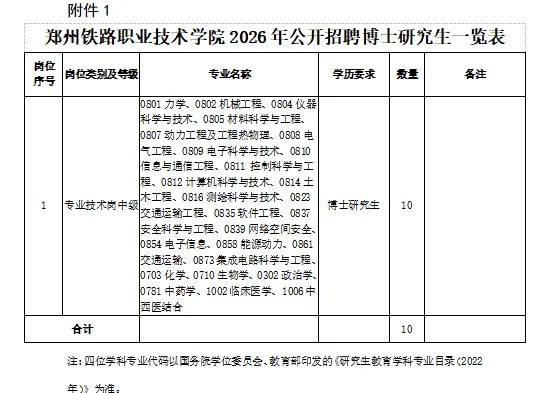 7.岗位所需的专业和其他条件详见《郑州铁路职业技术学院2026年公开招聘博士研究生一览表》。
