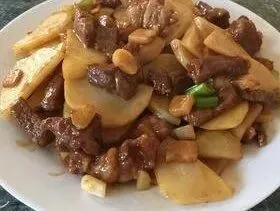 酸汤酥肉、土豆炒牛肉、醋溜西葫芦、米酒芋圆、红豆米饭、千禧果。