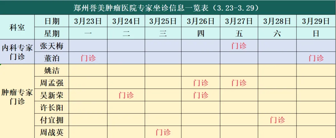 【本周专家预告】郑州誉美肿瘤医院3月23日-3月29日专家坐诊安排来啦!