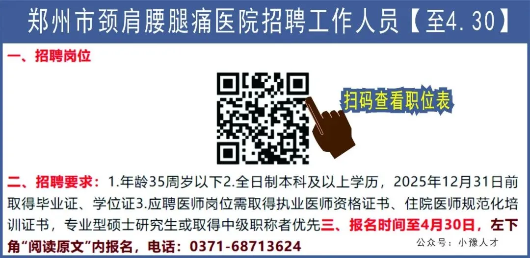 >郑州市颈肩腰腿痛医院招聘工作人员【至4.30】