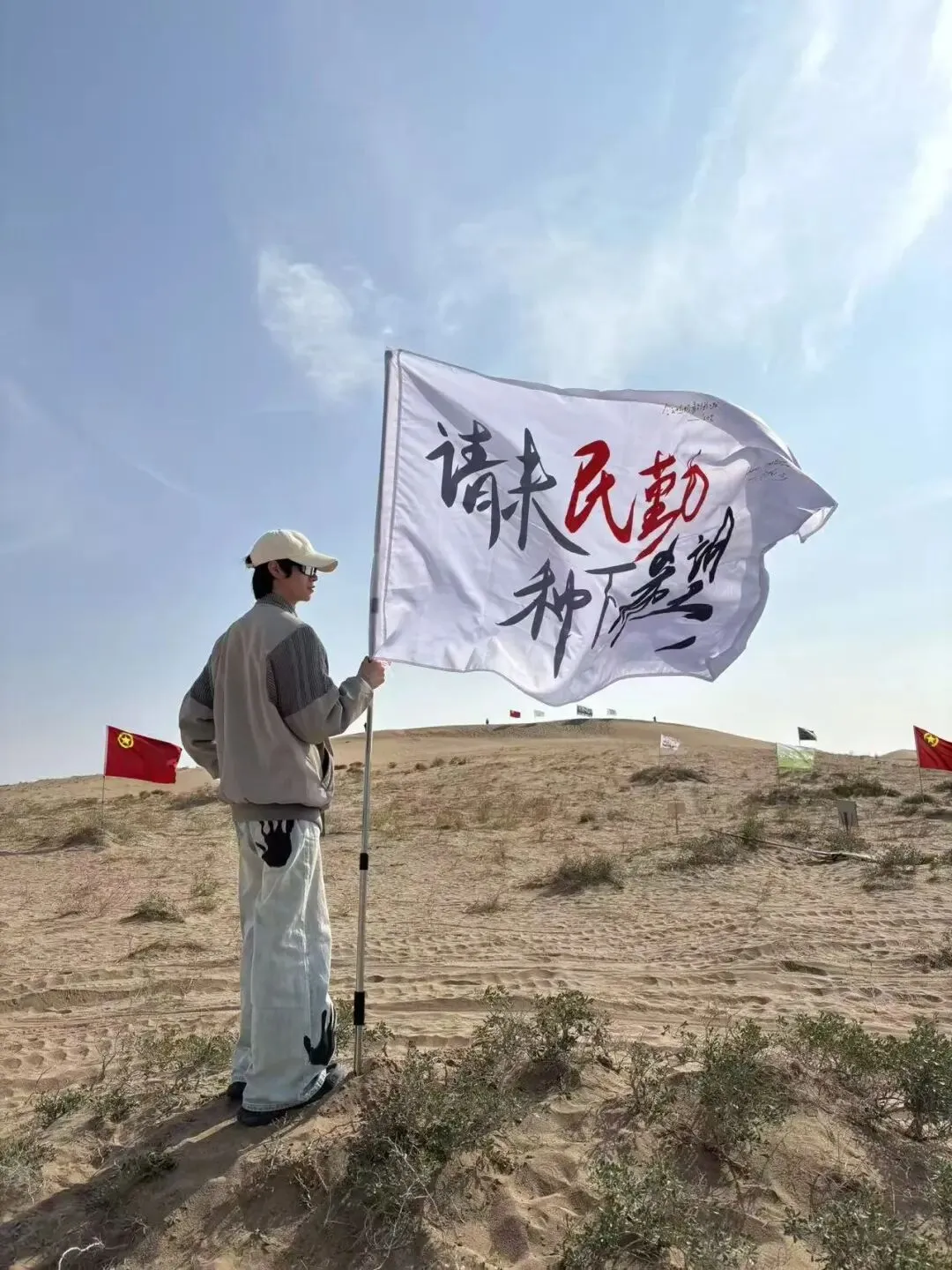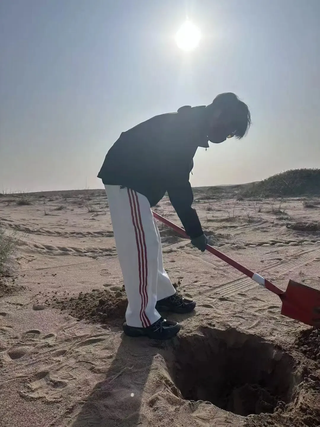 每年春秋,当风沙还在民勤的沙丘上肆虐时,常明博就会和来自全国各地的志愿者们一起,像候鸟般准时奔赴这片土地。他挥起铁锹,在沙地上挖出一个个树坑,小心翼翼地将梭梭、红柳的幼苗栽进土里,再用黄沙仔细掩埋好根系。沙丘前,一行行新苗在风里挺立,就像他无声的誓言,要为这片荒漠披上绿装。常明博总说:“雷锋同志能在平凡岗位上发光发热,我们在治沙一线,也能把小事做好。”