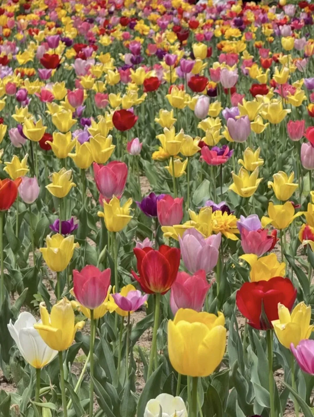 三月下旬,问花节的主角——郁金香,正盛大登场。北门东侧赏花区内,百万株、数十个品种的郁金香层层叠叠铺开,从浅粉到殷红,从鹅黄到淡紫,奶白、橘红、墨紫……数十种花色交织成巨型彩虹花毯,顺着园间地势蜿蜒伸展。风车伫立在花田旁,蓝天为幕,花海为席,阳光洒在饱满的花瓣上,泛着温柔的光泽,连风都带着淡淡的甜香。