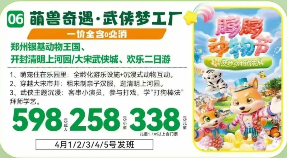 早酒店享用早餐后,出发前往车赴前往郑州【郑州银基动物王国】(游玩时间5小时左右/门票全含0必消)开启萌兽奇遇之旅!打卡梦幻动物园奇幻世界,翡翠海,生命岛,巨龙山谷五大主题区域,可乘水陆两栖车穿越野生动物散养区,与老虎,狮子,长颈鹿,斑马等珍稀萌兽近距离接触;打卡网红打卡点生命之树,欣赏震撼的裸眼3D光影秀;观看《老虎神殿》《海狮剧场》《萌宠剧场》等精彩动物表演,玩转亲子游乐项目,尽情享受与萌兽相伴的欢乐时光.下午15:00左右集合,乘车返回温馨的家.服务标准: