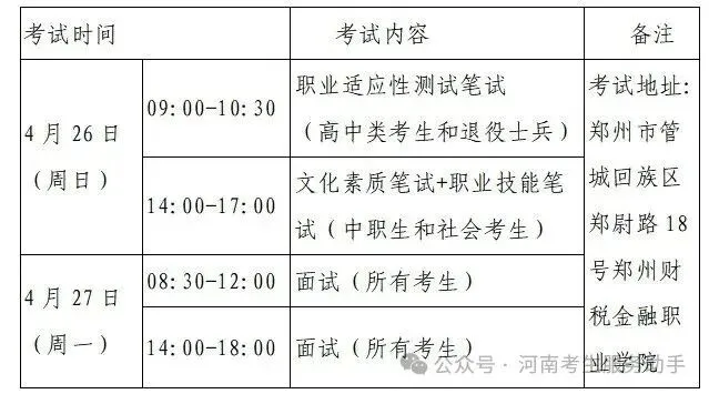 考试地址:郑州市管城回族区郑尉路18号。考生持本人准考证和身份证参加考试,4月25日14:00-18:00可在我校东北门门外查看考场分布图。报名、考试期间交通和食宿费用自理。