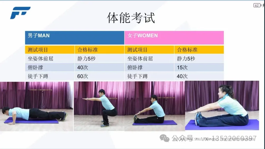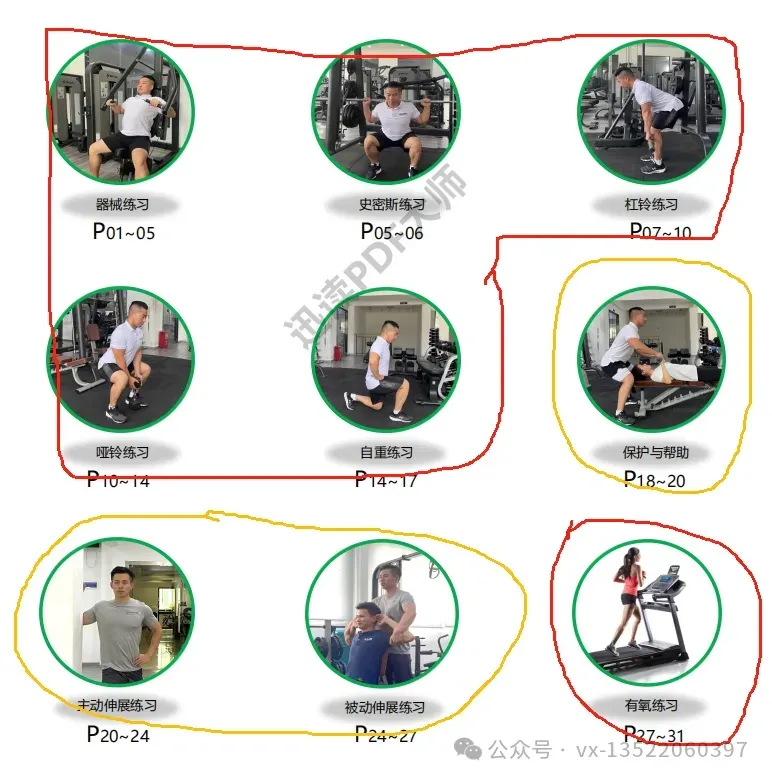 抽考7个动作:其中3个抗阻力动作+2个拉伸动作+1个保护动作+1个有氧器械