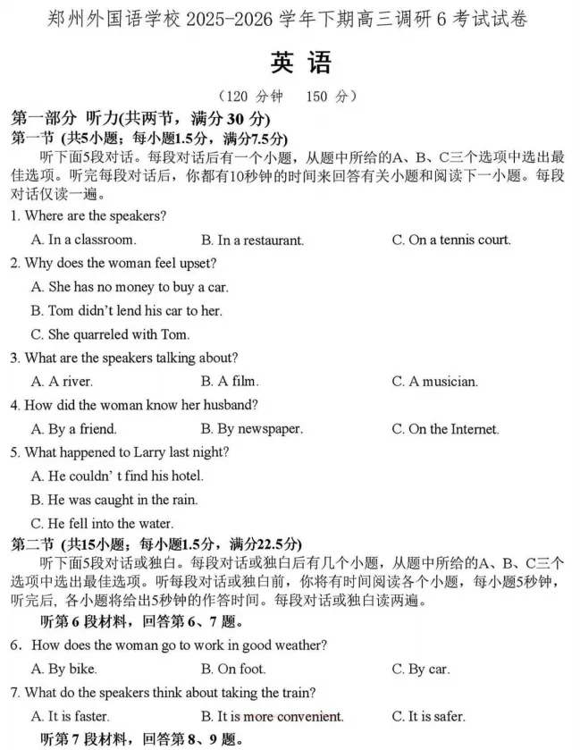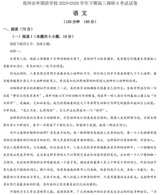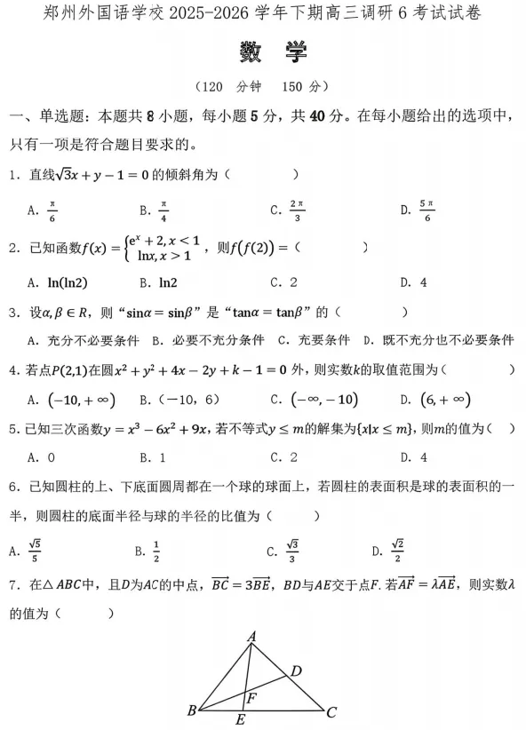 >郑州外国语中学2025-2026学年高三下学期3月调研6(语数英物化地)试卷及参考答案