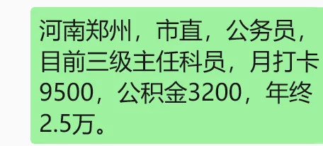 小编了解到,有位在河南郑州市直单位工作的公务员,目前是三级主任科员。他每月打卡工资 9500 元,公积金 3200 元,年终奖金大概 2.5 万元,整体收入在当地算是比较不错的水平。