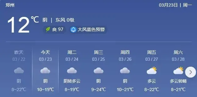 郑州市:今天白天到夜里,阴天转小雨。偏东风2到3级。
