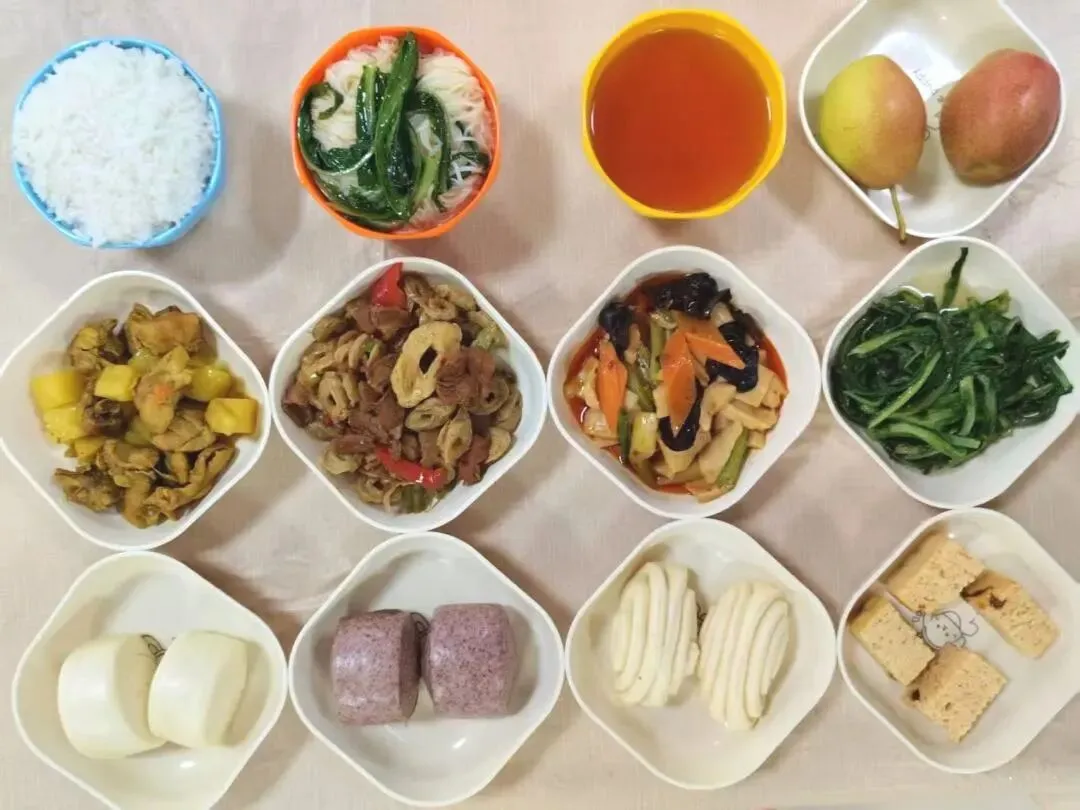 新派红烧肉 金汤肉片豆腐 鸡蛋凉粉 香菇青菜 米饭 葱花面 花卷 馒头 发糕 紫薯馒头 杂粮发糕 绿豆粥 | 土豆100五花肉50鸟蛋15 豆腐90肉片30 鸡蛋30凉粉80蒜台20 香菇10青菜110 米饭150 葱花5面条150青菜10 面粉60 面粉60 面粉60 面粉60紫薯2 杂粮面60 绿豆30 |
