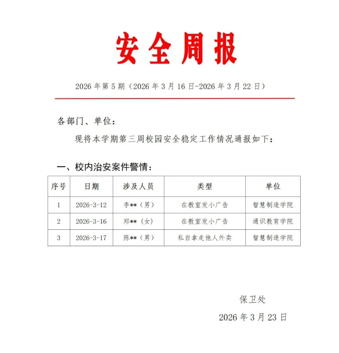 郑州经贸学院保卫处(部)情况通报(第三周)