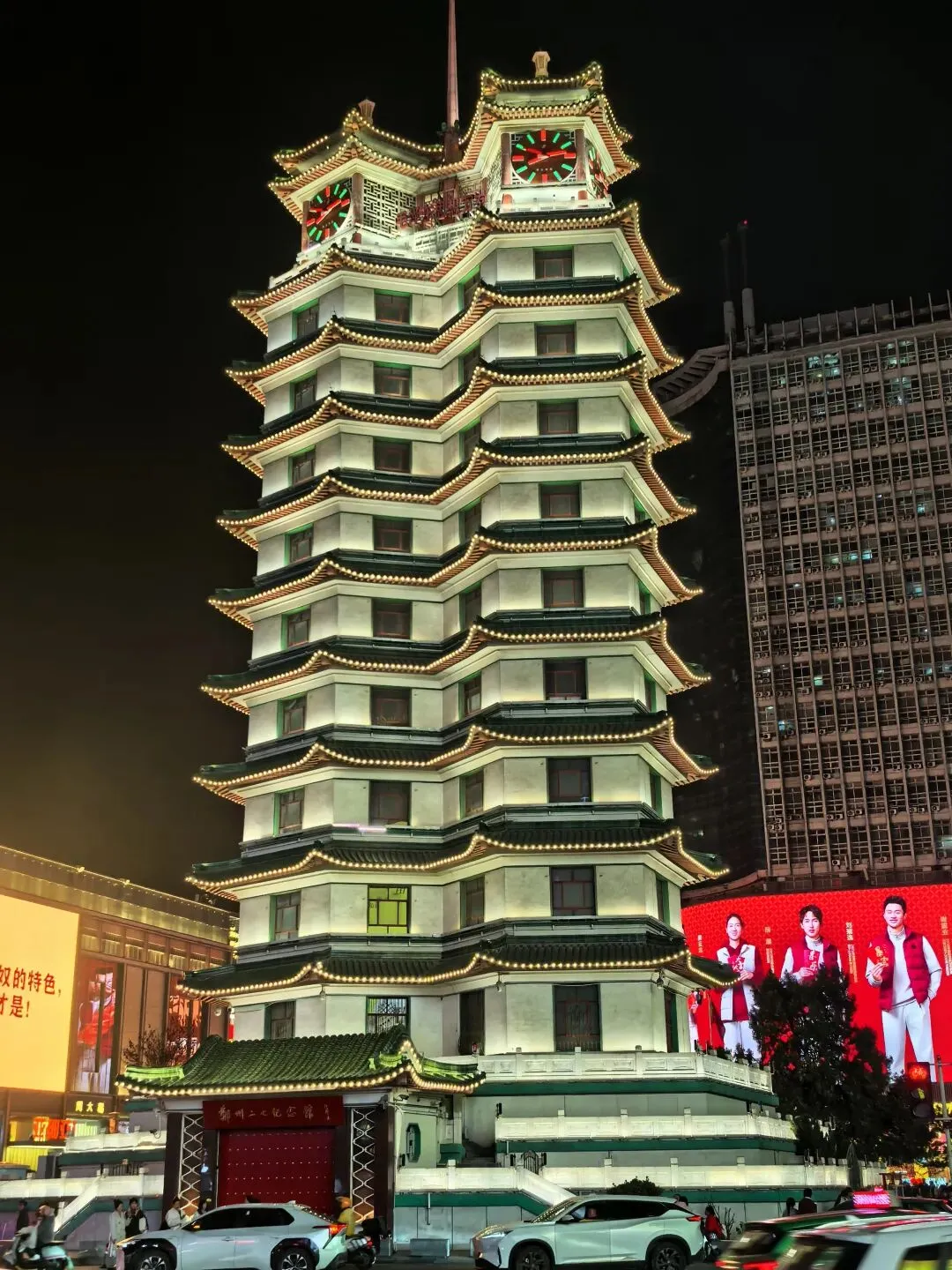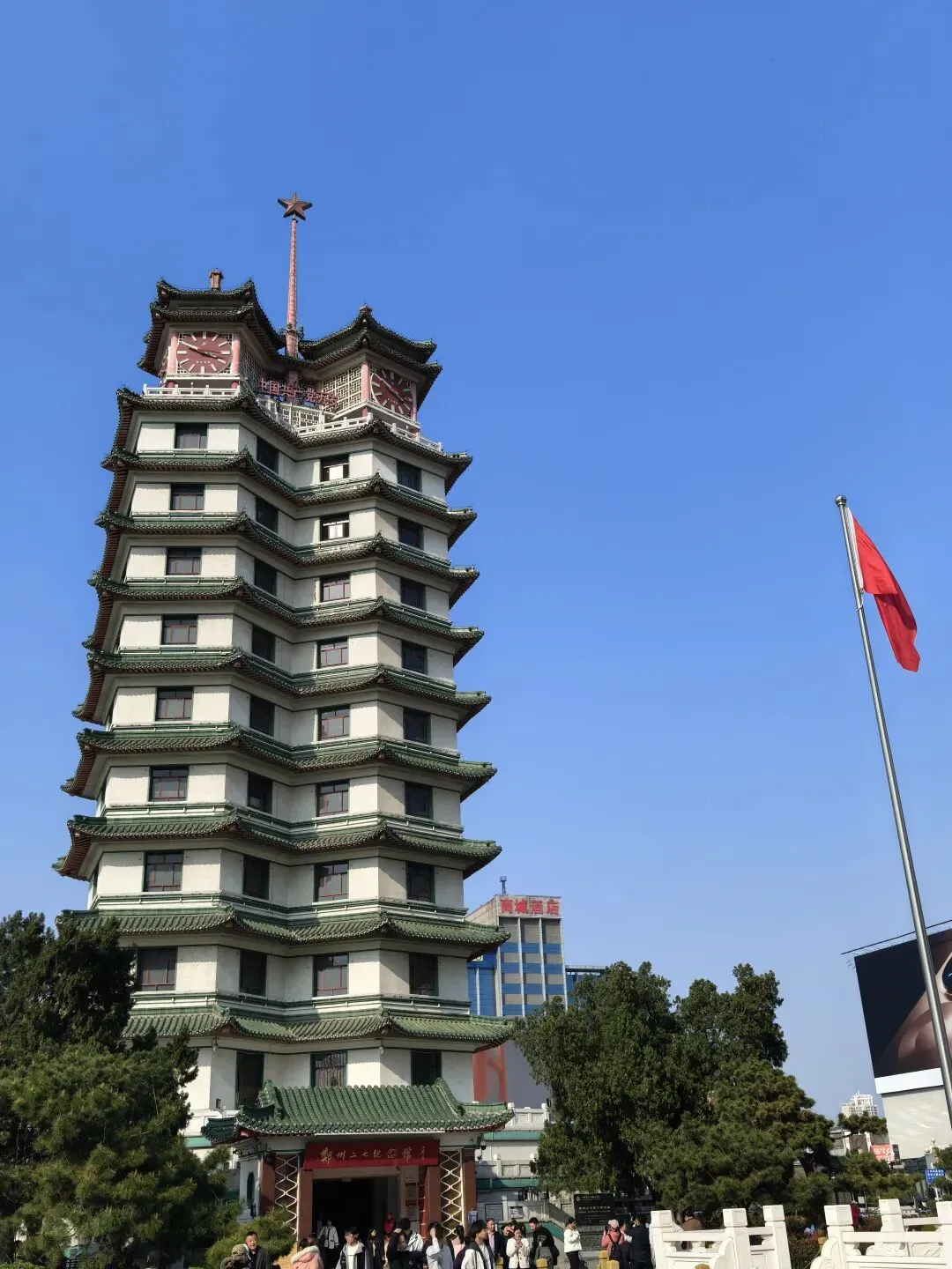 一出二七广场地铁口,迎面就是二七纪念塔,网上的图片非常宏伟壮观,现实看着却感觉到被塔周边的高楼反衬,显得十分矮小。作为广场的标志性建筑,是为了纪念1921年京汉铁路大罢工,当局杀害工人的二七惨案而建。它设计双塔并联,平面看呈两个五角星形并联,象征团结与力量;塔尖高矗一枚红五星,象征革命精神永放光芒。塔高14层63米,塔顶有六面直径2.7米的大钟,整点演奏《东方红》乐曲。现在的二七广场不仅是纪念场所,更成为郑州的城市精神象征,它地处城市中心,周边商圈林立,交通便利,和重庆解放碑有相似之处,正如郑州人常说:"没到二七塔,就等于没到过郑州"。