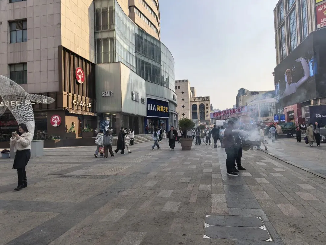 二七广场旁边就是德化步行街,取以德化人之意,和成都春熙路一样的商业步行街,街道两边的巨幅电子屏幕,5D的动物和钢铁侠扑面而来,仿佛一下子袭倒街道的人群,这种方式夹带的广告颇为吸引人的眼球。街上蜜雪冰城店门口小年轻们排着长队,几个新疆小伙身挎着烧烤炉,蹦跳着烤肉串叫卖,尽管人流也多,但总体感觉这周边的环境,好像和成都春熙路及重庆解放碑商圈还略差一丢丢。