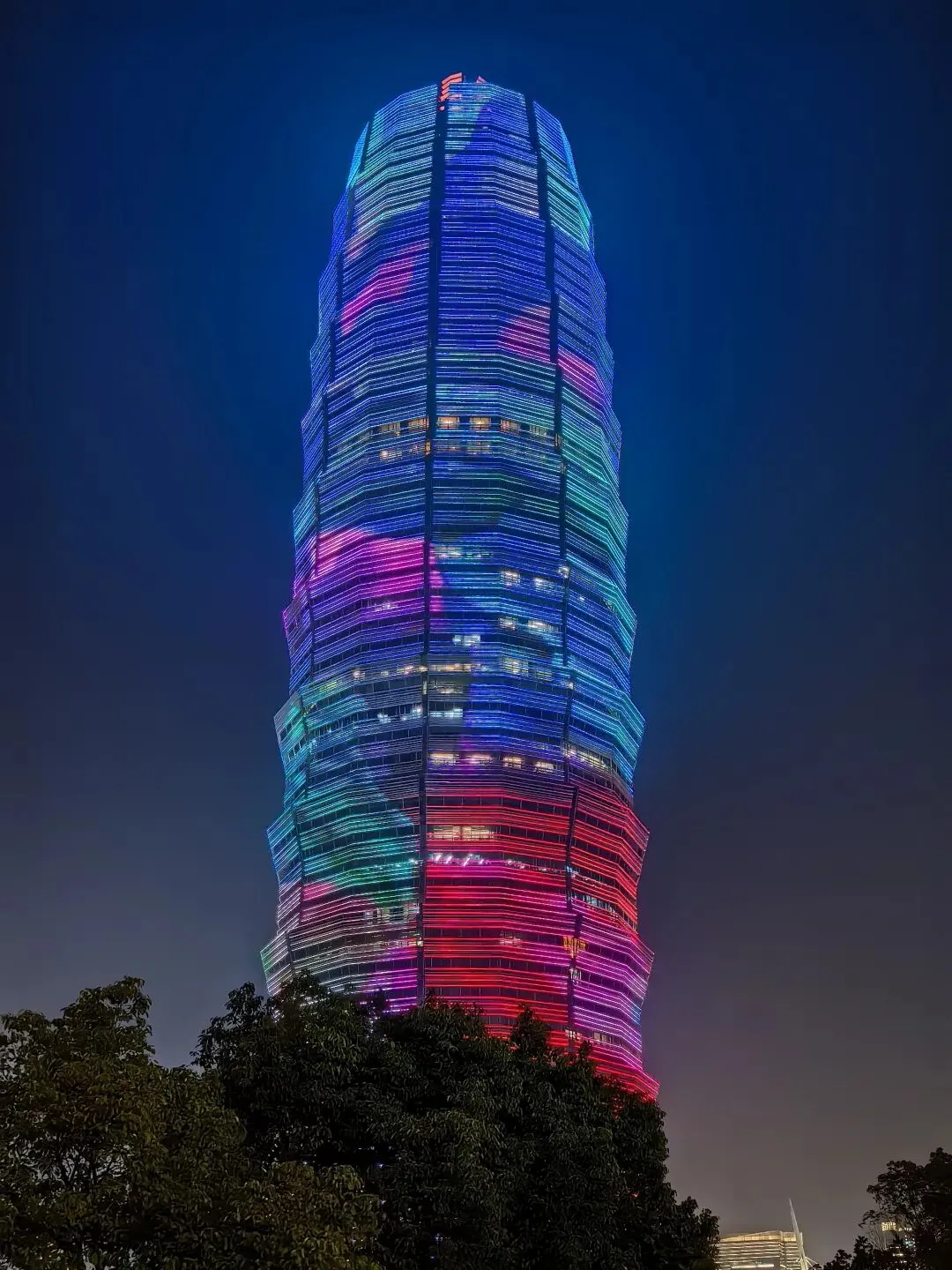 白天看那独树一帜的高楼灯头缠满全身,夜晚全楼灯光全部亮起,各种色彩螺旋状转换,通体如披着各色绸缎在滑动变幻,和环湖周边楼房上的灯光互相呼应,一同倒映在湖水里,加之水上喷泉变幻,一时湖光楼色,使人目不暇接,精彩异常。