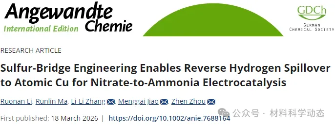 2026年3月18日,郑州大学周震、焦梦改、张利利等人在Angewandte Chemie International Edition发表了标题为《Sulfur-Bridge Engineering Enables Reverse Hydrogen Spillover to Atomic Cu for Nitrate-to-Ammonia Electrocatalysis》的论文,Ruonan Li为论文第一作者,周震、焦梦改、张利利为论文共同通讯作者。
