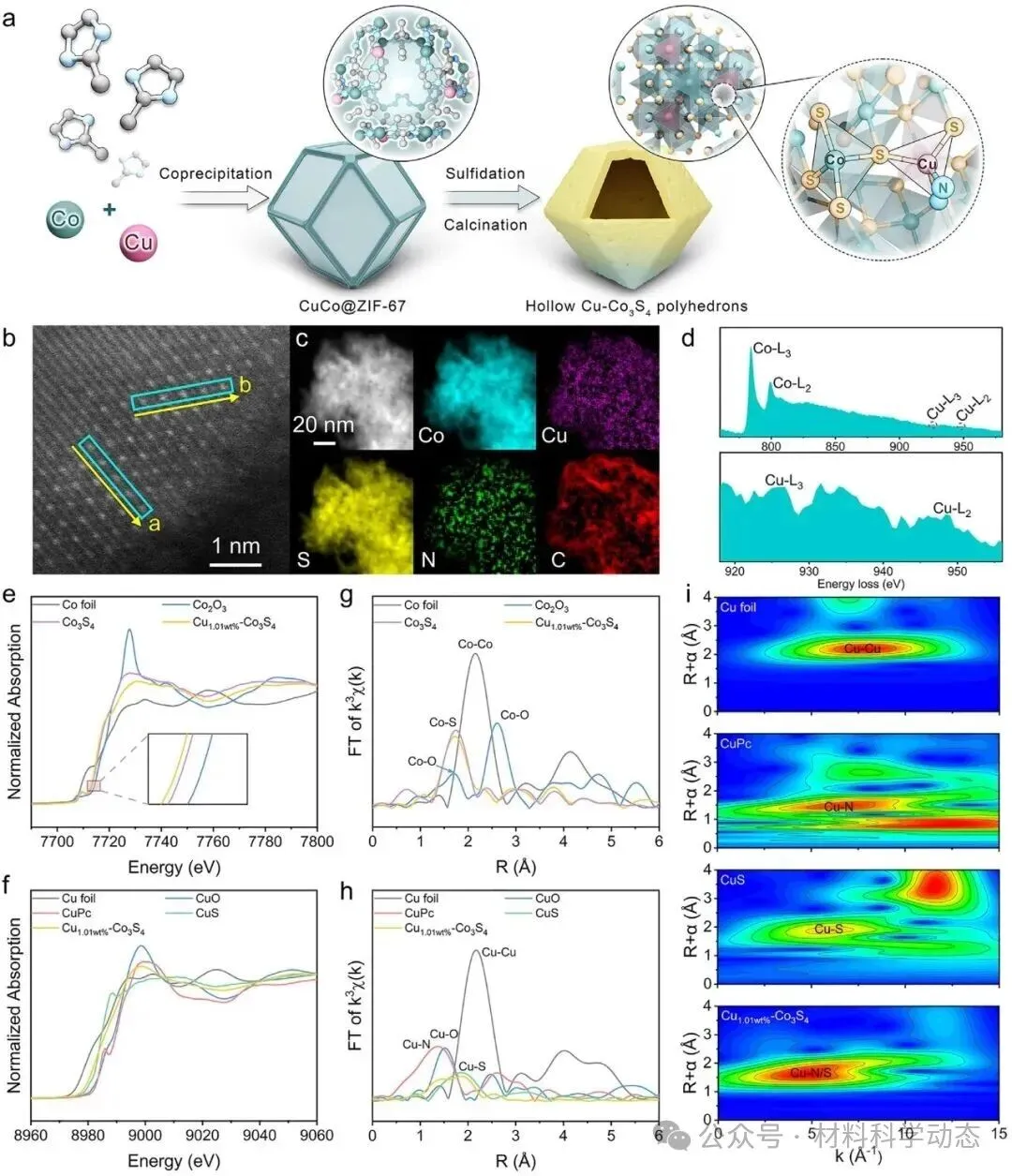 图1 | (a) 催化剂合成示意图;(b) Cu1.01wt%-Co3S4的放大HAADF-STEM图像;(c) 对应的元素 mapping;(d) EELS谱;(e) Co K边和(f) Cu K边XANES谱;(g) Co K边和(h) Cu K边EXAFS谱;(i) Cu K边WT-EXAFS谱(Cu1.01wt%-Co3S4与参比样品)