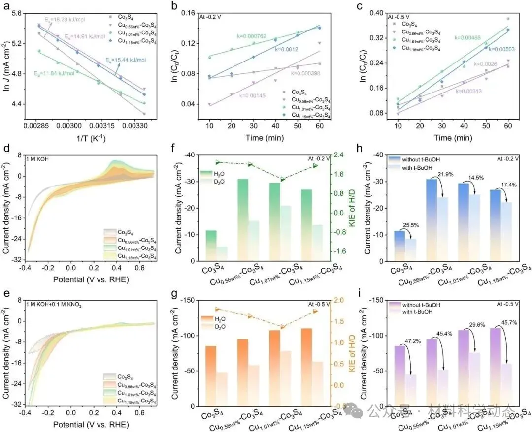 图3 | (a) 合成催化剂的活化能Ea值;(b) -0.2 V和(c) -0.5 V下的线性化准一级动力学曲线;(d) 样品在1 M KOH和(e) 含0.1 M KNO3的1 M KOH中的CV曲线;不同催化剂在(f) -0.2 V和(g) -0.5 V下的动力学同位素效应;(h) -0.2 V和(i) -0.5 V下添加或不添加叔丁醇时催化剂的电流密度变化