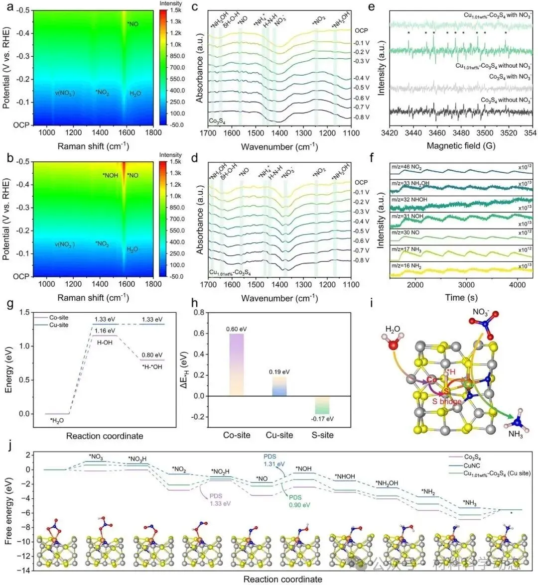 图4 | (a, b) Co3S4和Cu1.01wt%-Co3S4在给定电位下的原位拉曼光谱;(c, d) Co3S4和Cu1.01wt%-Co3S4在给定电位下的原位FT-IR光谱;(e) -0.8 V下,Co3S4和Cu1.01wt%-Co3S4在含或不含0.1 M KNO3的1 M KOH中电解后电解液的准原位EPR谱;(f) Cu1.01wt%-Co3S4在-0.8 V下的电化学在线DEMS谱;(g) Co位点和Cu位点上水解离的能垒;(h) Cu1.01wt%-Co3S4的Co、Cu、S位点的*H吸附能;(i) Cu1.01wt%-Co3S4上通过S桥反向氢溢流实现水解离和NO3RR的示意图;(j) Co3S4、CuNC和Cu1.01wt%-Co3S4上NO3RR的吉布斯自由能图