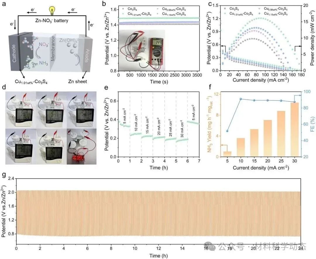 图5 | (a) 以Cu1.01wt%-Co3S4为阴极的Zn-NO3−电池放电过程示意图;(b) 开路电压和(c) 制备催化剂的放电极化与功率密度曲线;(d) Cu1.01wt%-Co3S4基Zn-NO3−电池供电的温湿度时间传感器和LED显示屏的数码照片;(e) Cu1.01wt%-Co3S4基Zn-NO3−电池在不同电流下的放电性能测试;(f) 对应不同电流下的产率和法拉第效率;(g) Cu1.01wt%-Co3S4基Zn-NO3−电池在1 mA cm− 2下的反复充放电循环
