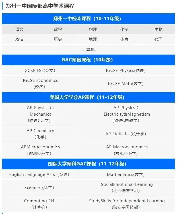 是郑州最早开设的一所公办学校国际部,主要开设高中学段,以英美澳国际课程为主,目前推出三种课程班制:中英A Level、中美AP和中澳VCE。