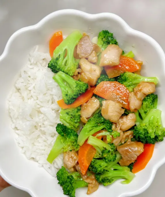 西兰花70g 肉片40g 腐竹100g 面粉100g 米饭100g