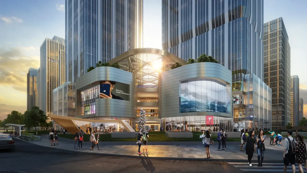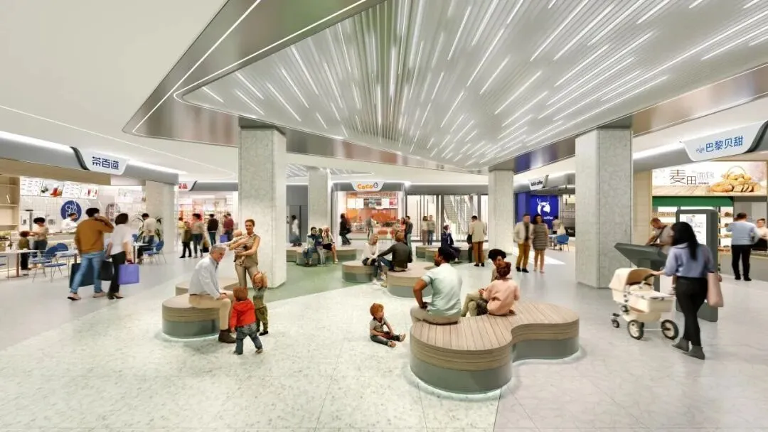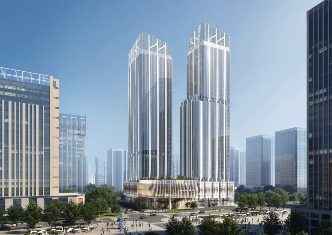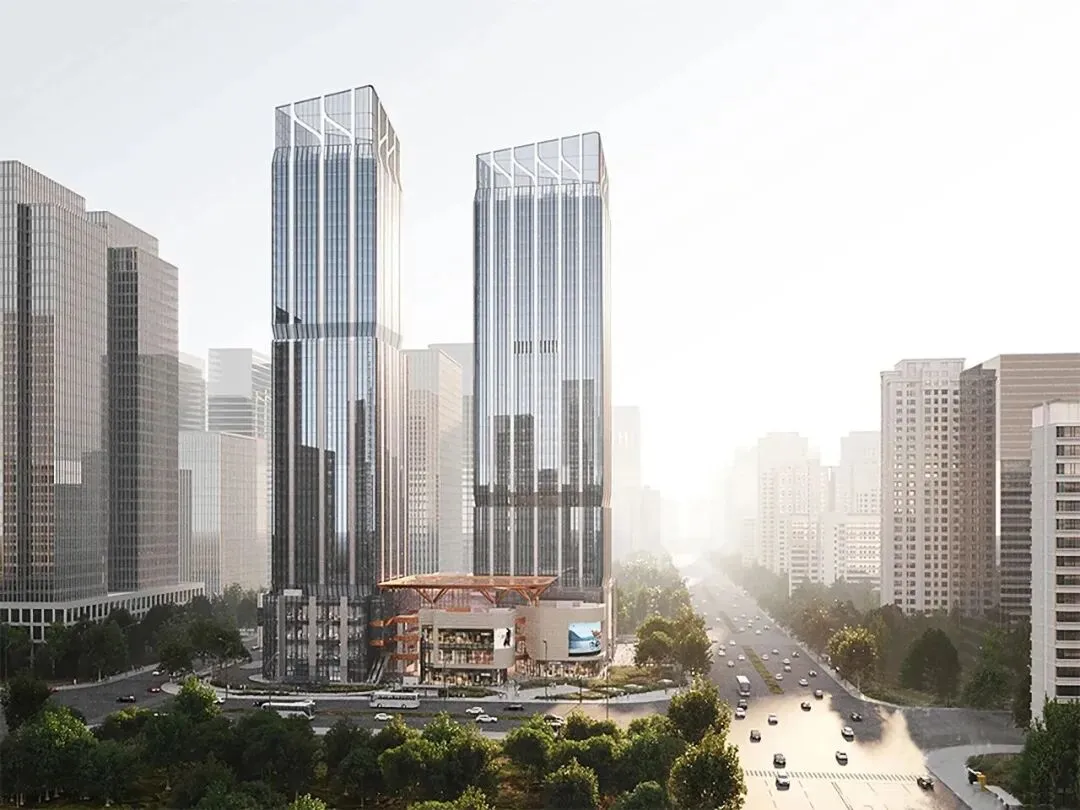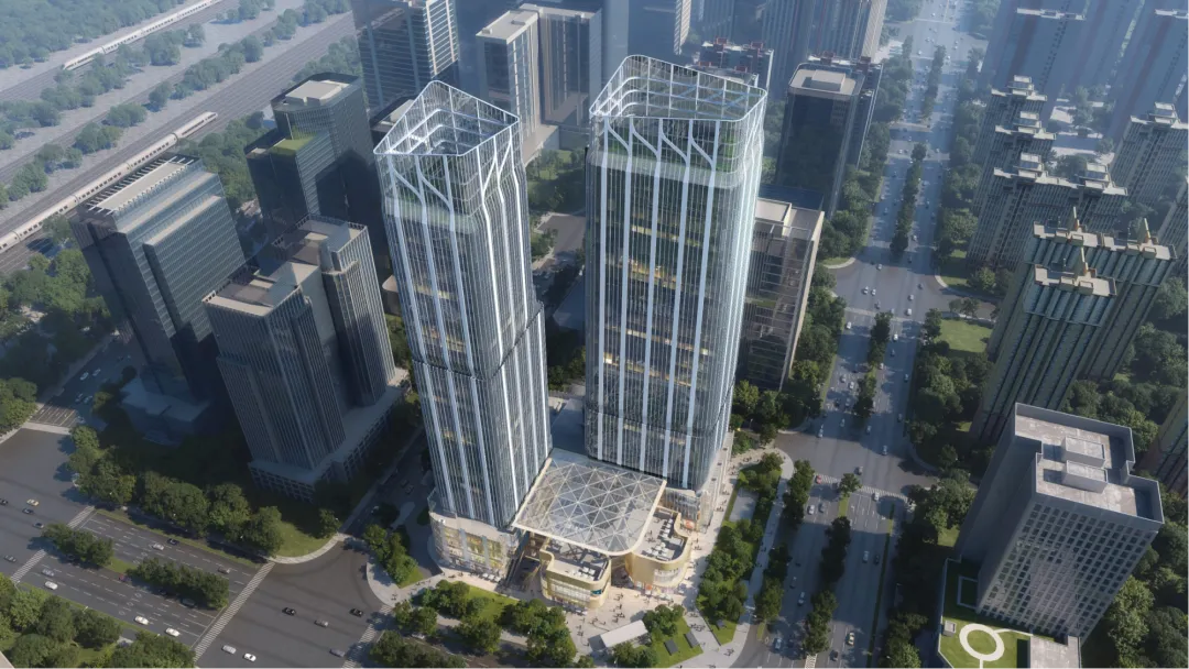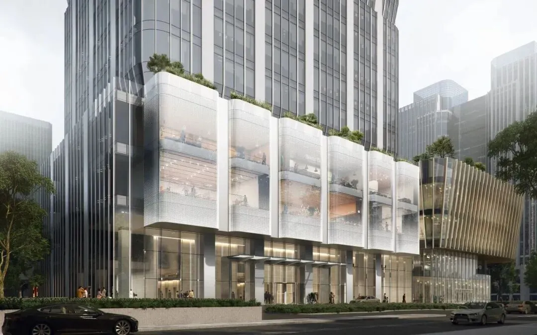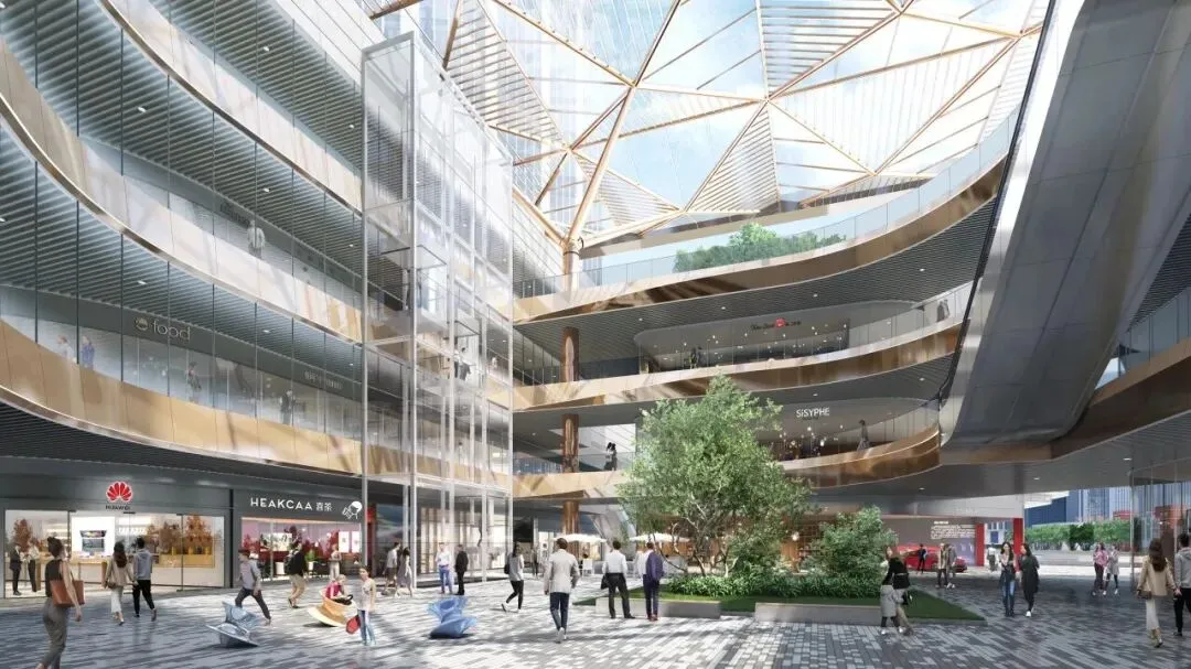 西侧塔楼为超甲级写字楼,地上32层,层高4.5米,以LEED金级认证为标准,打造国际一流办公环境;东侧塔楼为城市行政公寓,地上38层,层高3.6米,主要面向高端商务人士及家庭提供高品质居住空间。裙楼部分则为TOD开放式商业街区,面积约2.71万平方米,涵盖餐饮、购物、娱乐等多种业态,满足消费者多元化需求。B2层直通地铁5号线康宁街站厅,B1层设置网约车专属接驳区,实现地铁与商业、办公、居住的无缝换乘。此外,项目还规划了500米空中连廊,接驳周边5栋写字楼,形成立体慢行系统。