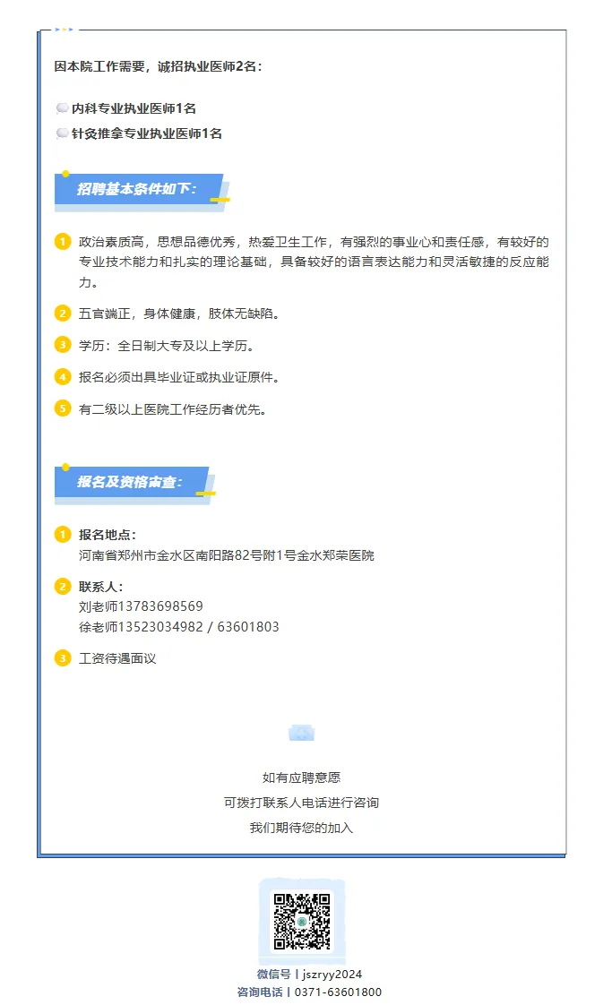 郑州市金水郑荣医院诚聘执业医师2名,千万别错过~
