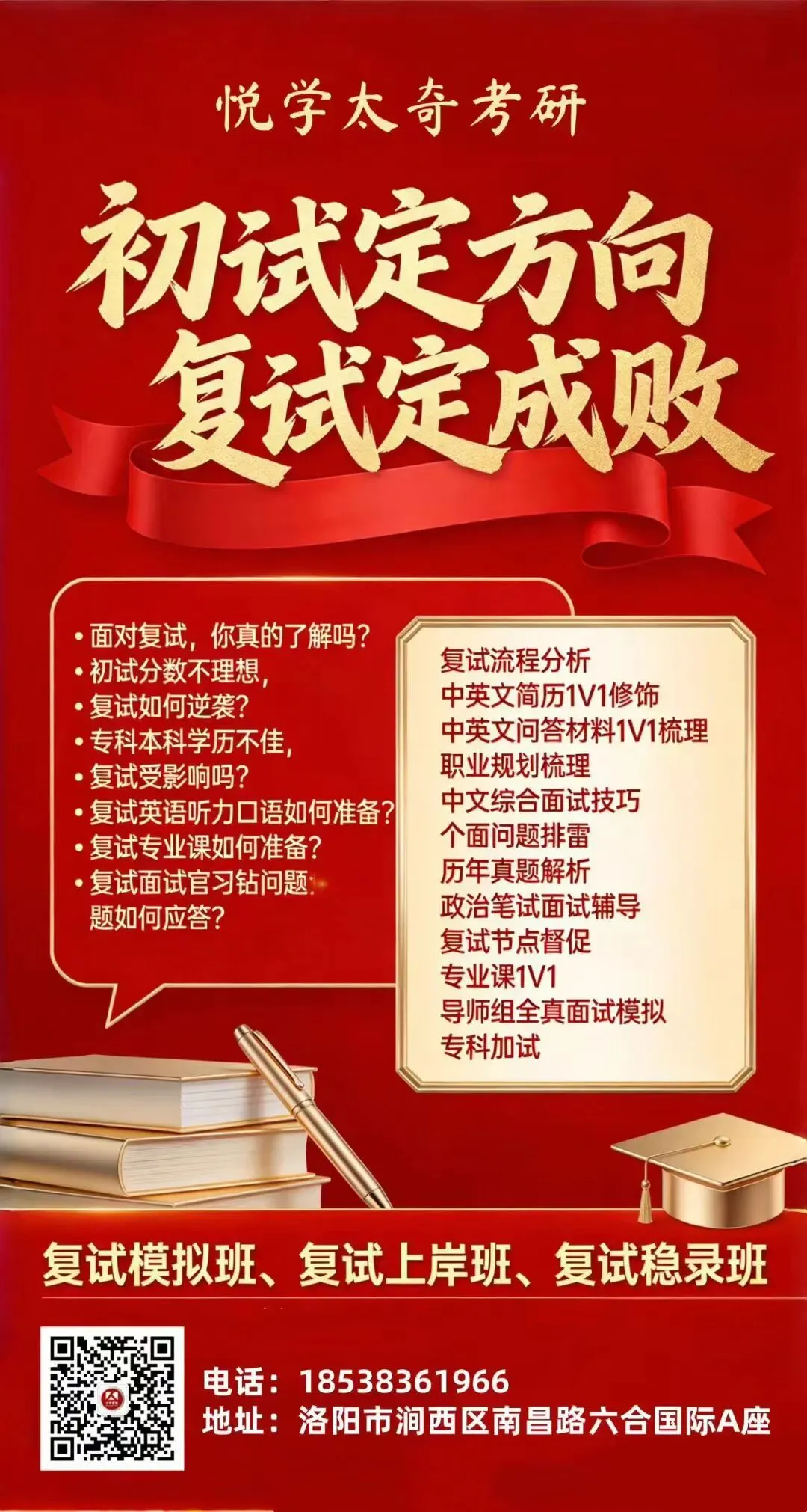 过线考生:立即关注报考学院通知,对照上述材料清单准备资格审查材料;结合自我介绍模板打磨专属版本,重点复习专业课与政治理论,悦学太奇考研28年复试辅导经验,可定制专属冲刺方案,快速提分、高效备战。