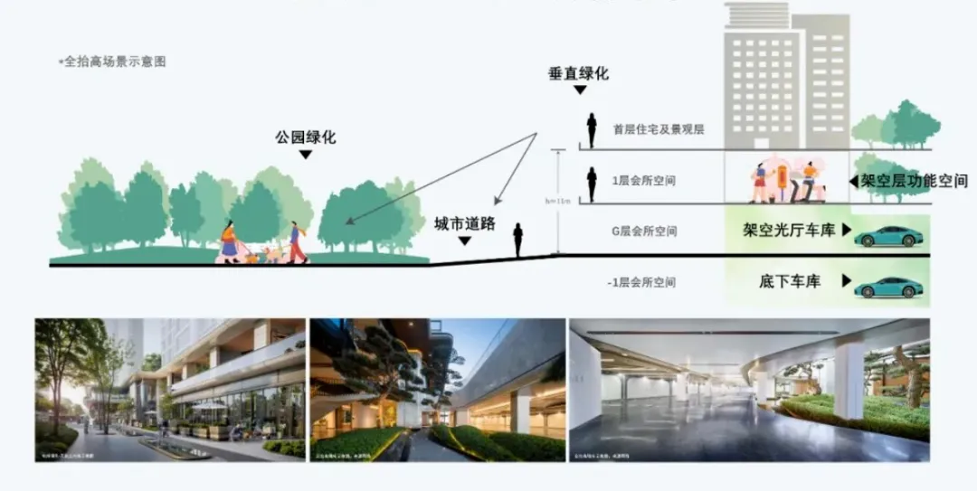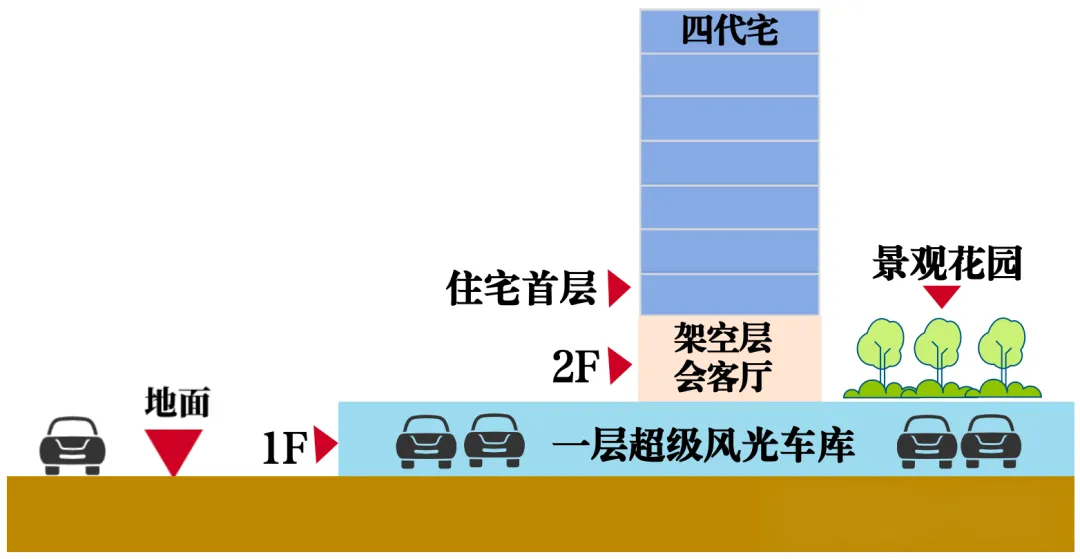 传统楼盘,地库埋在地下,社区地面和市政道路持平。抬板之后,地库升到地上1层,社区地面抬升到地上2层(G层),如果再有架空层,住宅首层相当于过去3层位置。