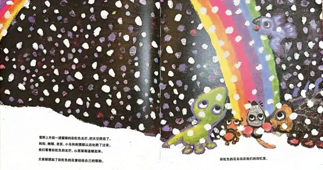 故事讲述了一朵彩虹色的花,它用自己美丽的花瓣,无私地帮助了遇到困难的小动物们,最后在冬天凋零。 整个故事没有说教,而是通过“花瓣一片一片消失”的细节,让孩子直观地感受到:付出不是失去,而是把温暖留在别人心里。故事的结尾,当春天来临时,新的彩虹色的花又会再次绽放,这个“生命轮回”的设定,能帮助孩子理解生命的自然过程,学会敬畏生命。