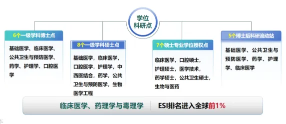 郑州大学河南医学院开设基础医学、临床医学、预防医学、药学、药物制剂、儿科学、口腔医学、护理学、医学检验技术、医学影像学、麻醉学、康复治疗学和医学影像技术等13个专业,其中临床医学为国家级一流专业, ESI 排名进入全球前0.52‰。现有基础医学、临床医学、护理学、公共卫生与预防医学、药学、口腔医学6个一级学科博士点、临床医学博士专业学位授权点、8个一级学科硕士学位授权点、5个硕士专业学位授权点、5个博士后科研流动站。13家附属医院,国家级临床重点专科54个,省级医学重点(培育)学科290个,开放床位数4万余张,年门诊量突破2500万人(次),获批7个国家区域医疗中心建设单位,集聚了河南主要的优质医疗资源,在疑难重症救治、重大公共卫生事件救治等方面发挥了重要作用。