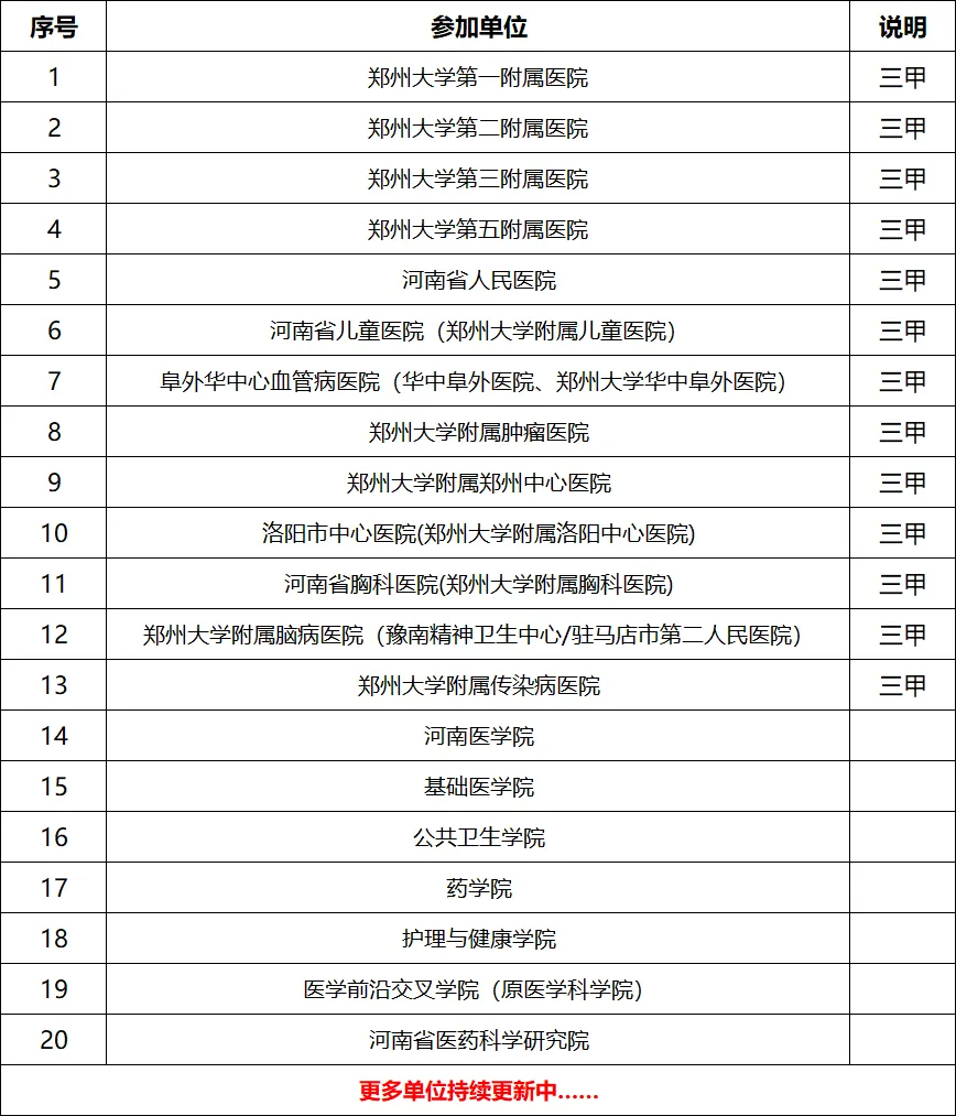 附属医院包括:第一附属医院、第二附属医院、第三附属医院、第五附属医院、人民医院、附属儿童医院、华中阜外医院、附属肿瘤医院、附属郑州中心医院、附属洛阳中心医院、附属胸科医院、附属传染病医院、附属脑病医院。13家附属医院现有国家级临床重点专科54个,7个国家区域医疗中心,省医学重点(培育)学科290个,开放床位数4万余张,年门诊量突破2500万人(次),集聚了河南省最优质的医疗资源,是河南省医学创新人才和高端人才培养的主要临床基地,发挥着重要的引领和示范作用。