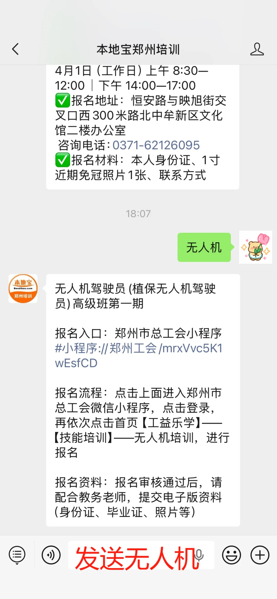 点击【私信】,对话框发送【无人机】