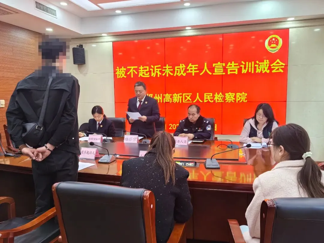 为充分履行检察职责,规范不起诉案件适用非刑罚处罚措施,近日,郑州高新区人民检察院举行未成年人不起诉宣告训诫会。在未成年人小文(化名)附条件不起诉监督考察期满后,依法作出不起诉决定,同步开展宣告训诫并送达督促监护令。未成年人小文及其法定代理人、公安机关办案人员到场参加仪式。