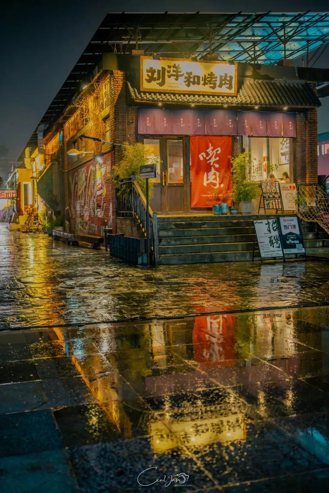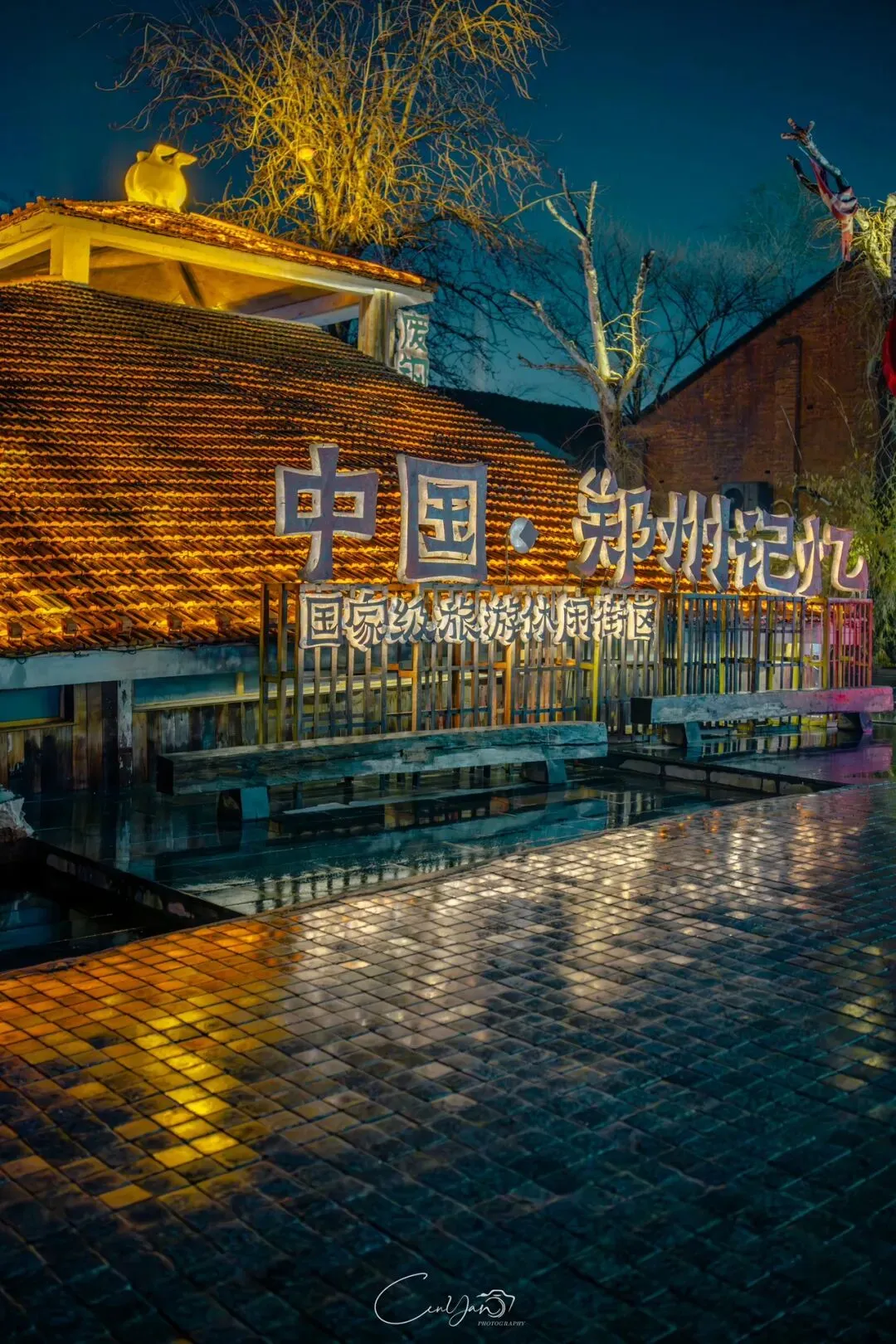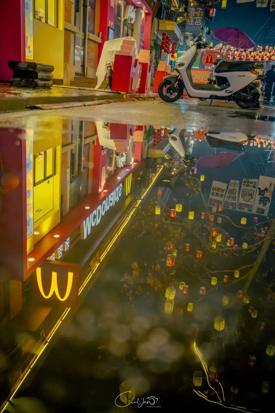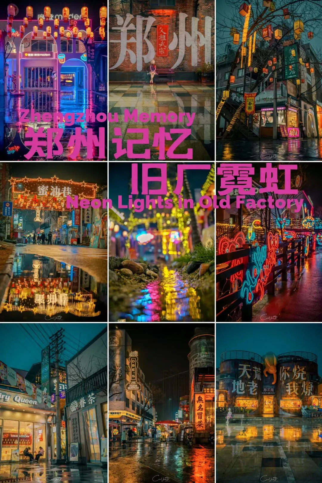 对我而言,摄影不只是记录好看的画面,更是留住一段情绪、一段故事、一段别人可能忽略的时光。雨夜的油化厂,就是这样一个地方:它新潮、好看、出片,但它骨子里,依然是那个1952年诞生、默默陪伴郑州长大的老工厂。当我收拾器材准备离开时,最后看了一眼这片被雨水浸润的园区。远处的法桐在风里轻晃,近处的灯笼在水面摇曳,积水里的霓虹依旧在流动。我知道,这些照片里的光影,终会随着时间淡去,但那份从中州肥皂到霓虹街巷的记忆,会一直留在郑州人的心里。它是老厂房的余温,是新烟火的跳动,是属于这座城市最温柔的时光回响。